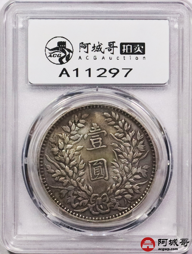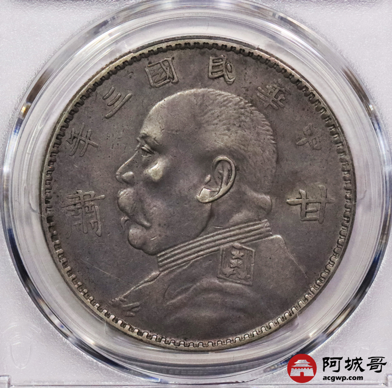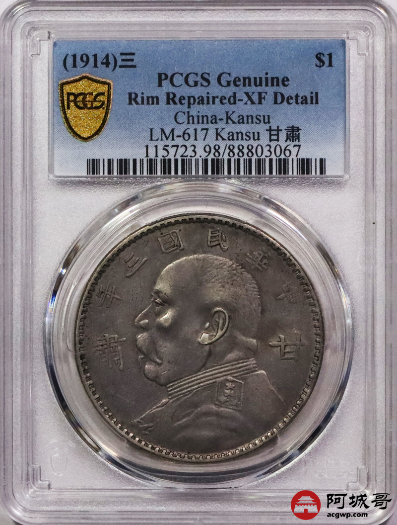 Lot:3122 1914民国三年袁世凯像“甘肃”加字壹圆银币一枚,原汁原味,低评状态 PCGS XF评级编号:88803067