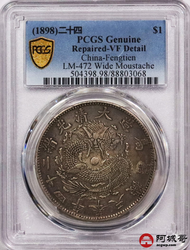 Lot:3279 1899光绪二十四年奉天机器局造大清壹圆银币一枚,原味包浆 PCGS VF