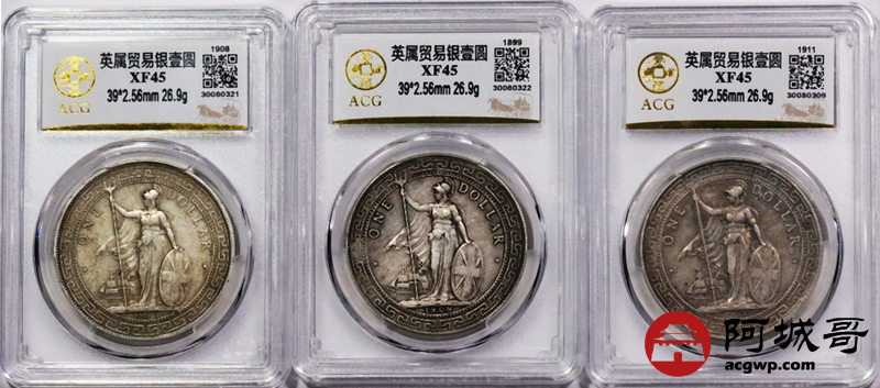 Lot:40 原味老包浆1899/1908/1911年站洋ACG XF45三枚