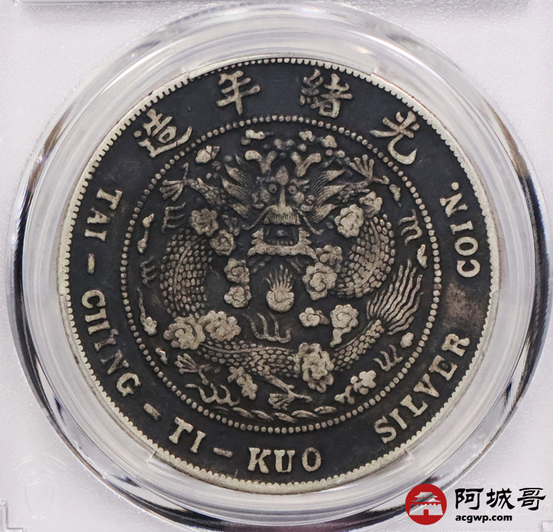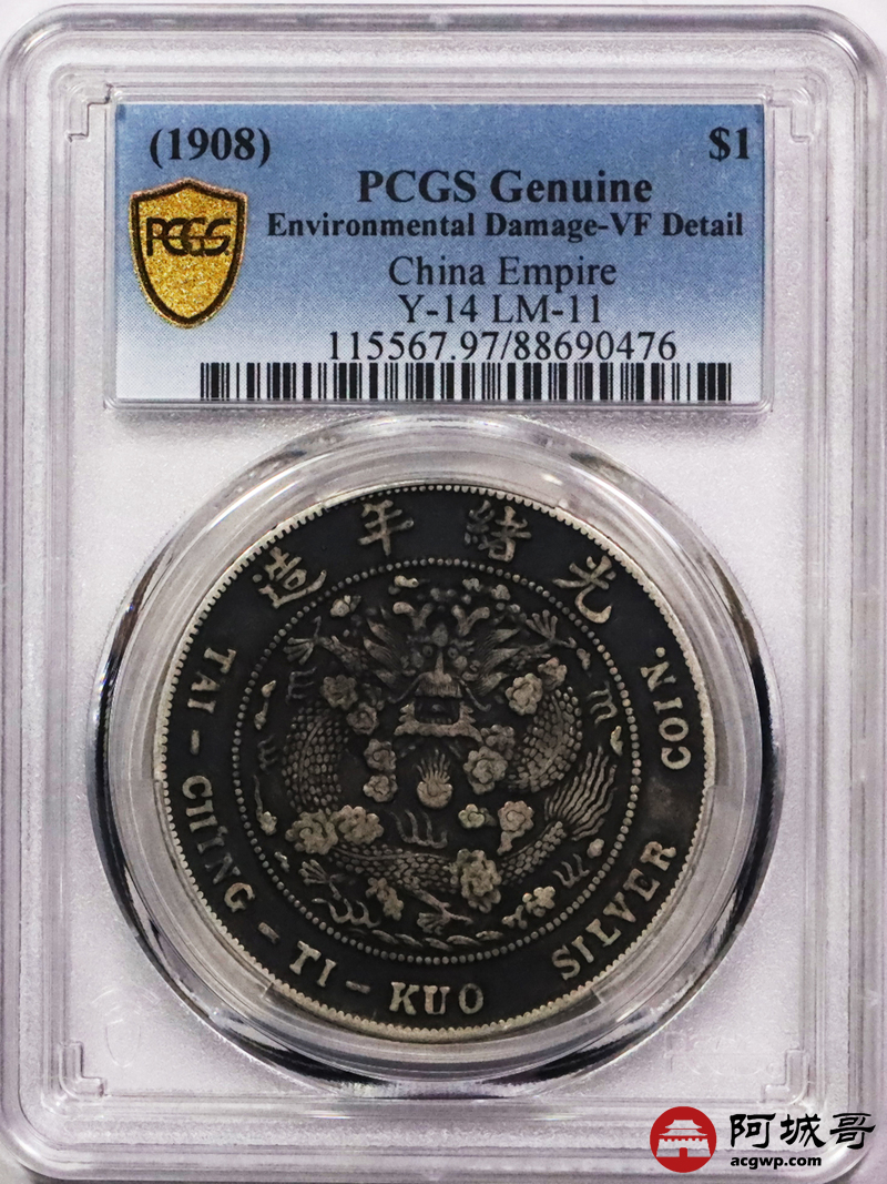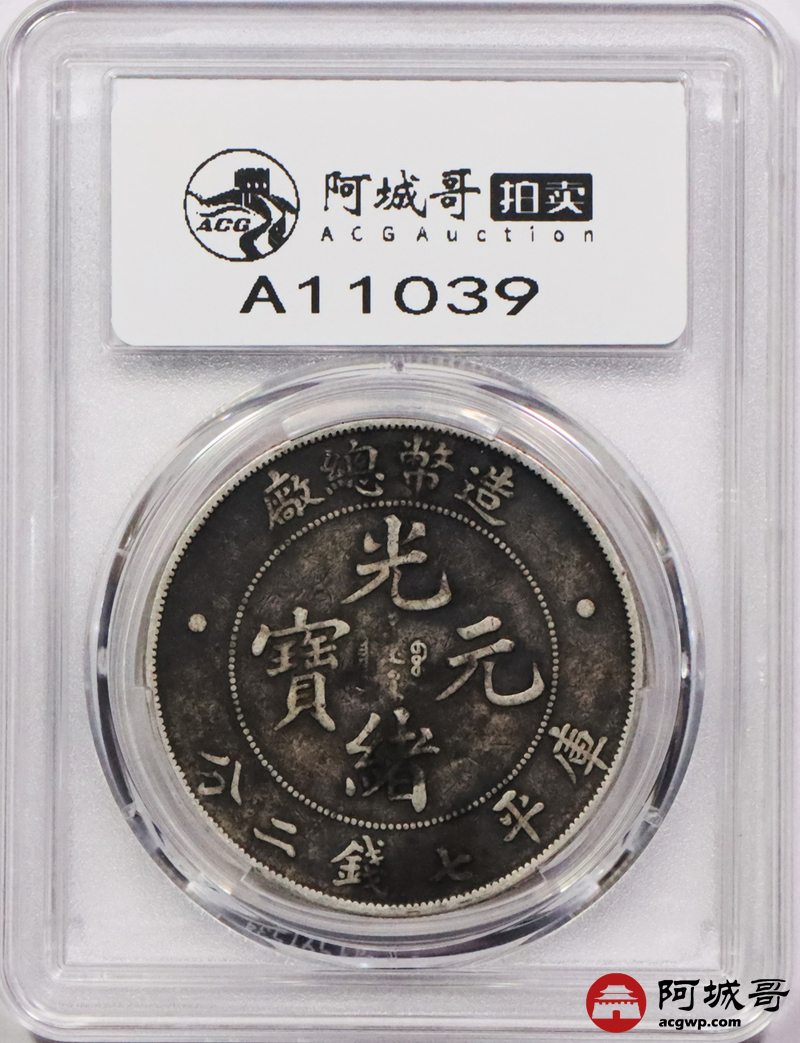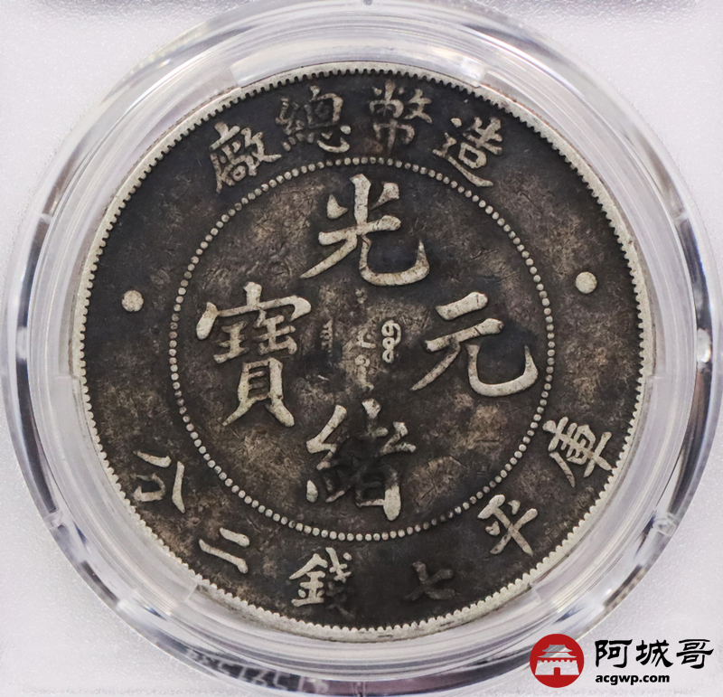 Lot:3023 1908光绪年造造币总厂光绪元宝库平七钱二分银币一枚,酱黑包浆 PCGS VF 评级编号:88690476