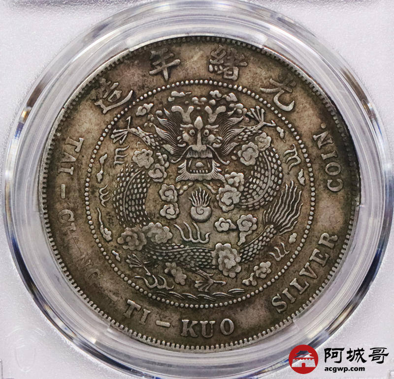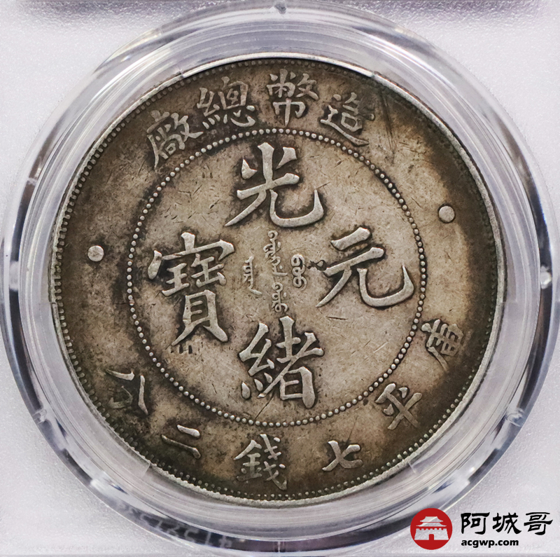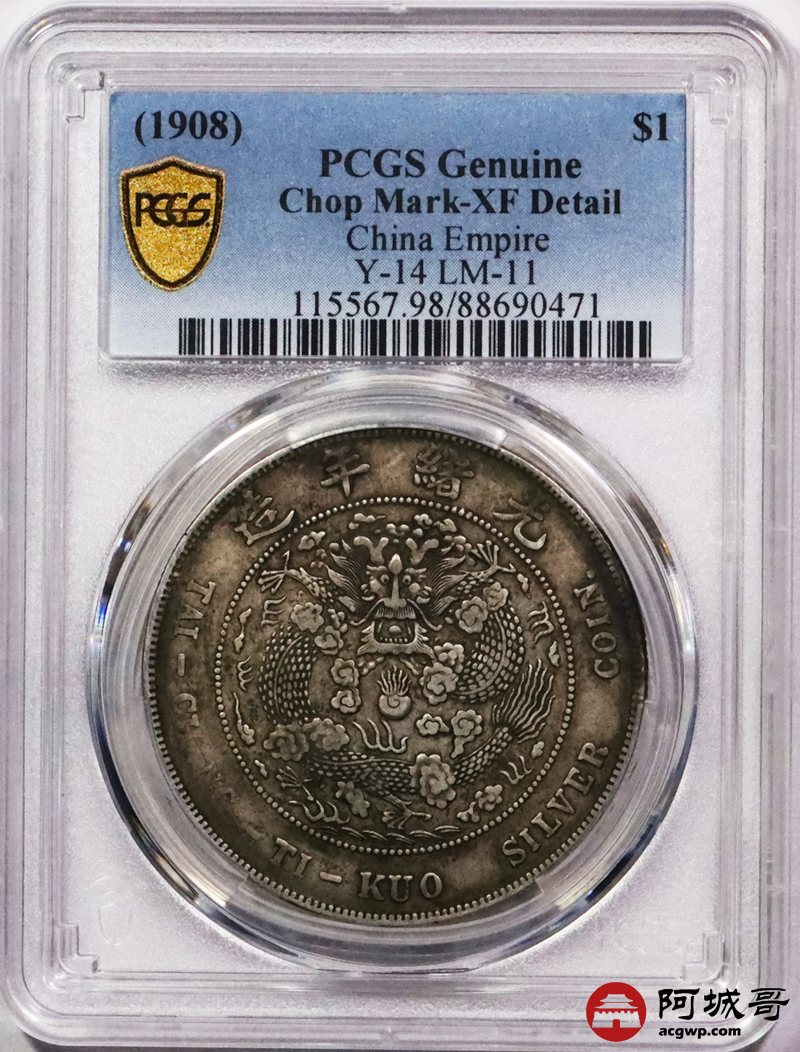 Lot:3002 1908光绪年造造币总厂光绪元宝库平七钱二分银币一枚,原味包浆 PCGS XF 评级编号:88690471