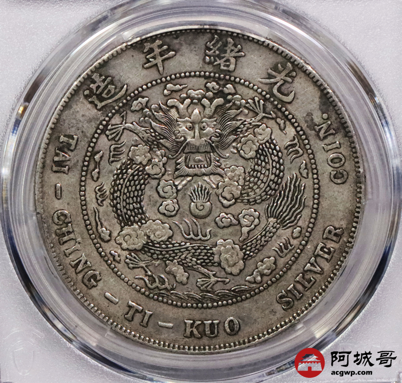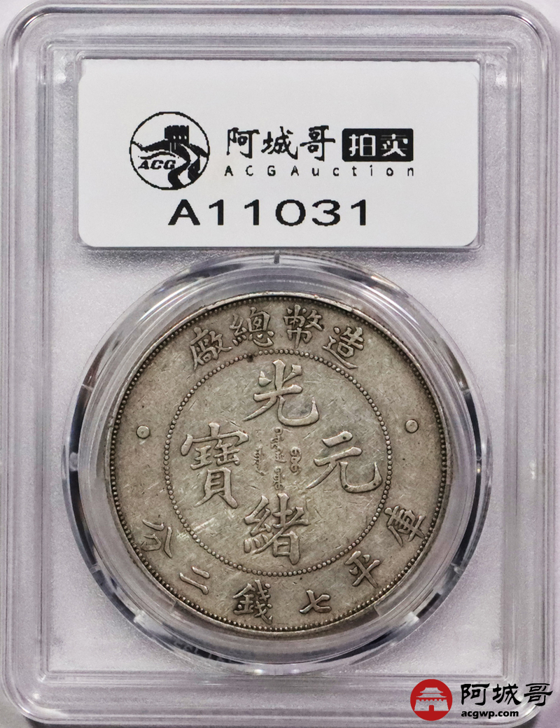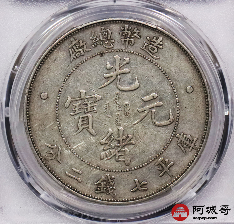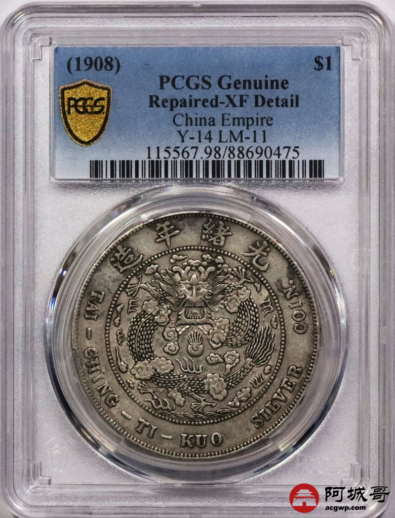 Lot:3020 1908光绪年造造币总厂光绪元宝库平七钱二分银币一枚,原味包浆 PCGS XF 评级编号:88690475