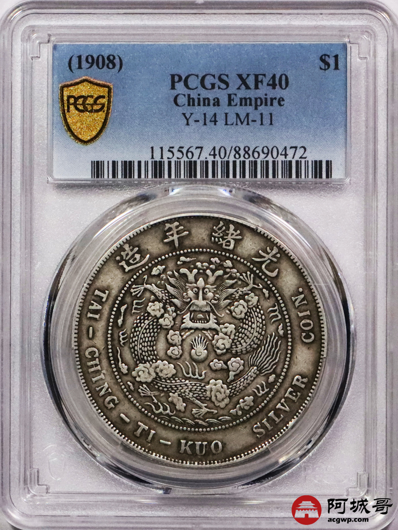 Lot:3001 1908光绪年造造币总厂光绪元宝库平七钱二分银币一枚,原味包浆 PCGS XF40