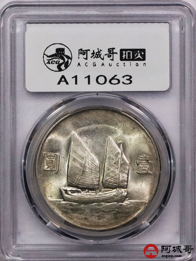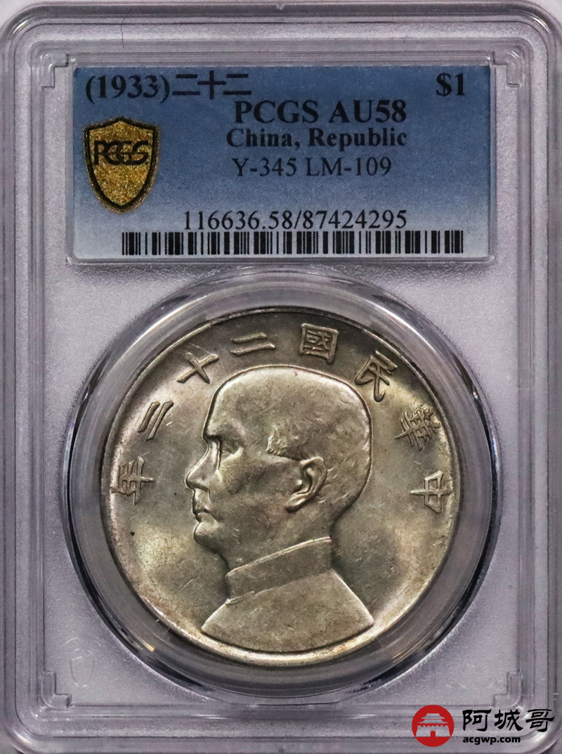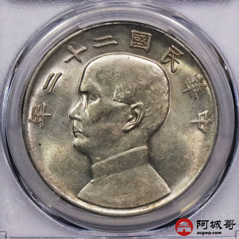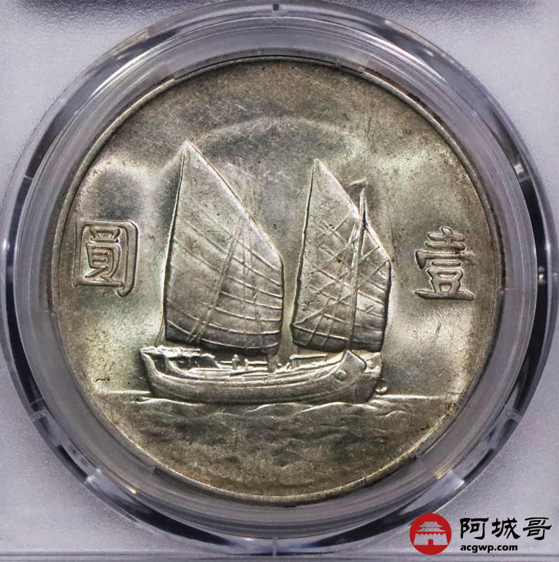 Lot:3552 1933民国二十二年孙中山像背帆船壹圆银币一枚,黄油底板 PCGS AU58 评级编号:87424295
