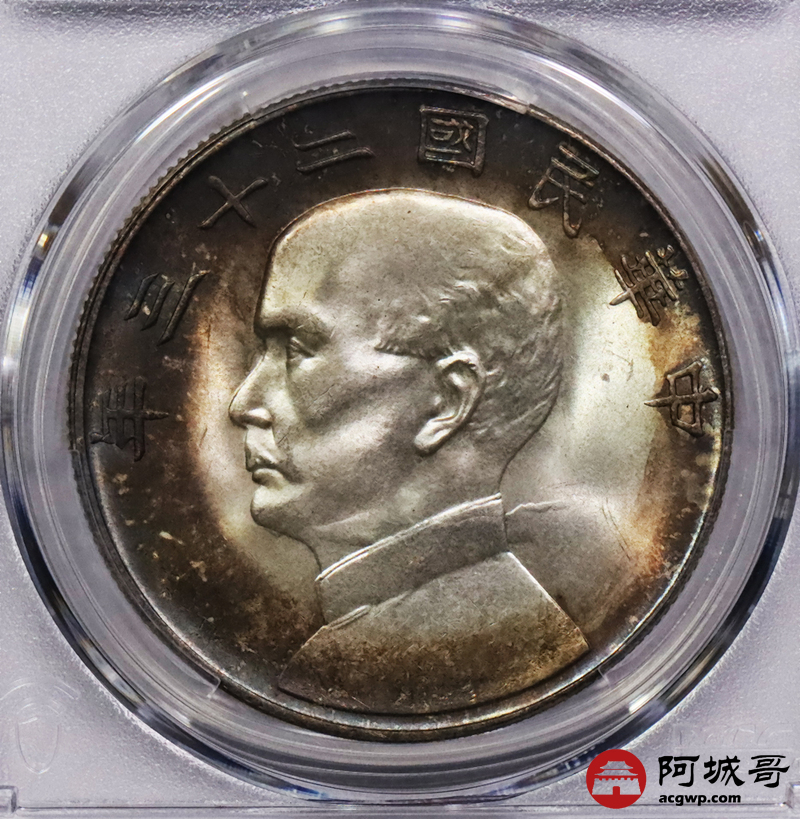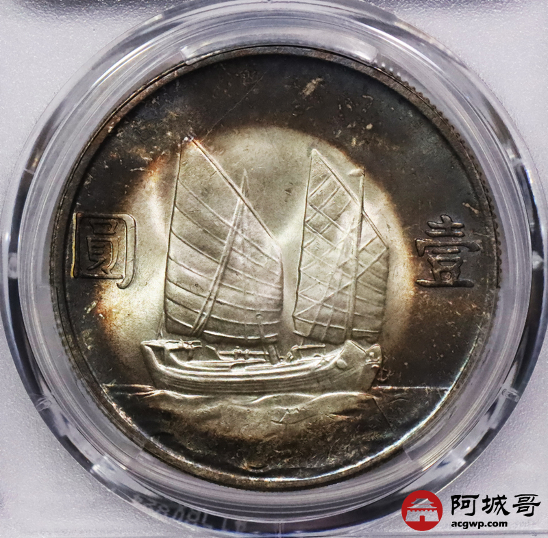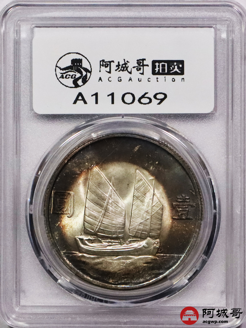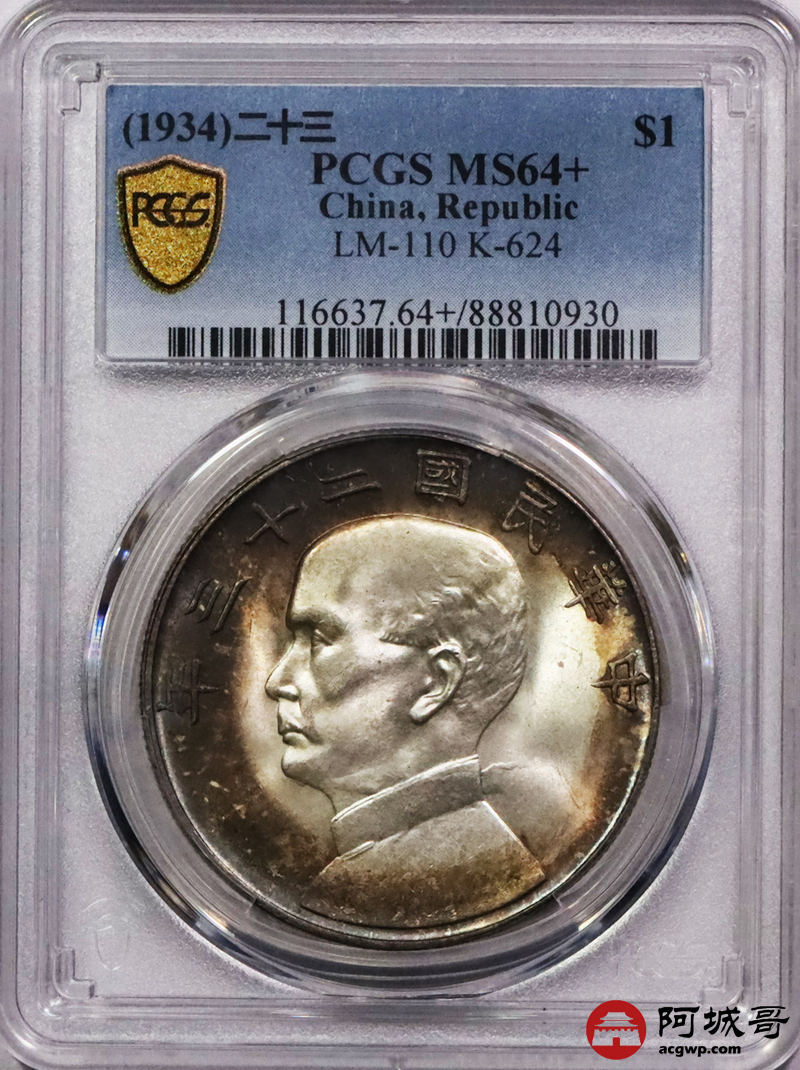 Lot:3204 1934民国二十三年孙中山像背帆船壹圆银币一枚,环彩包浆,大飘带 PCGS MS64+评级编号:88810930