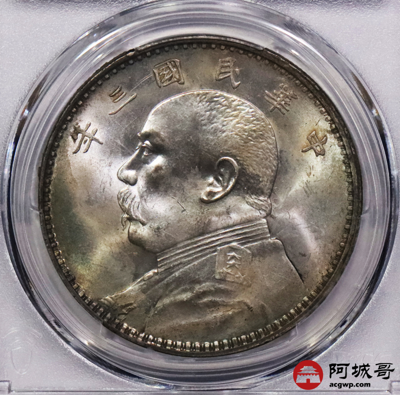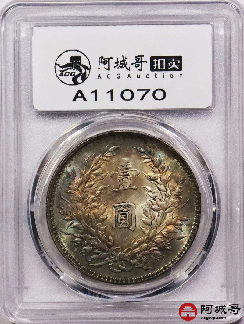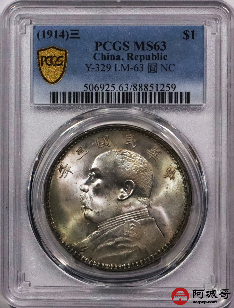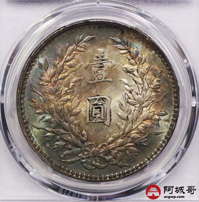 Lot:3483 1914民国三年袁世凯像背嘉禾壹圆银币一枚,环五彩包浆 PCGS MS63 评级编号:88851259