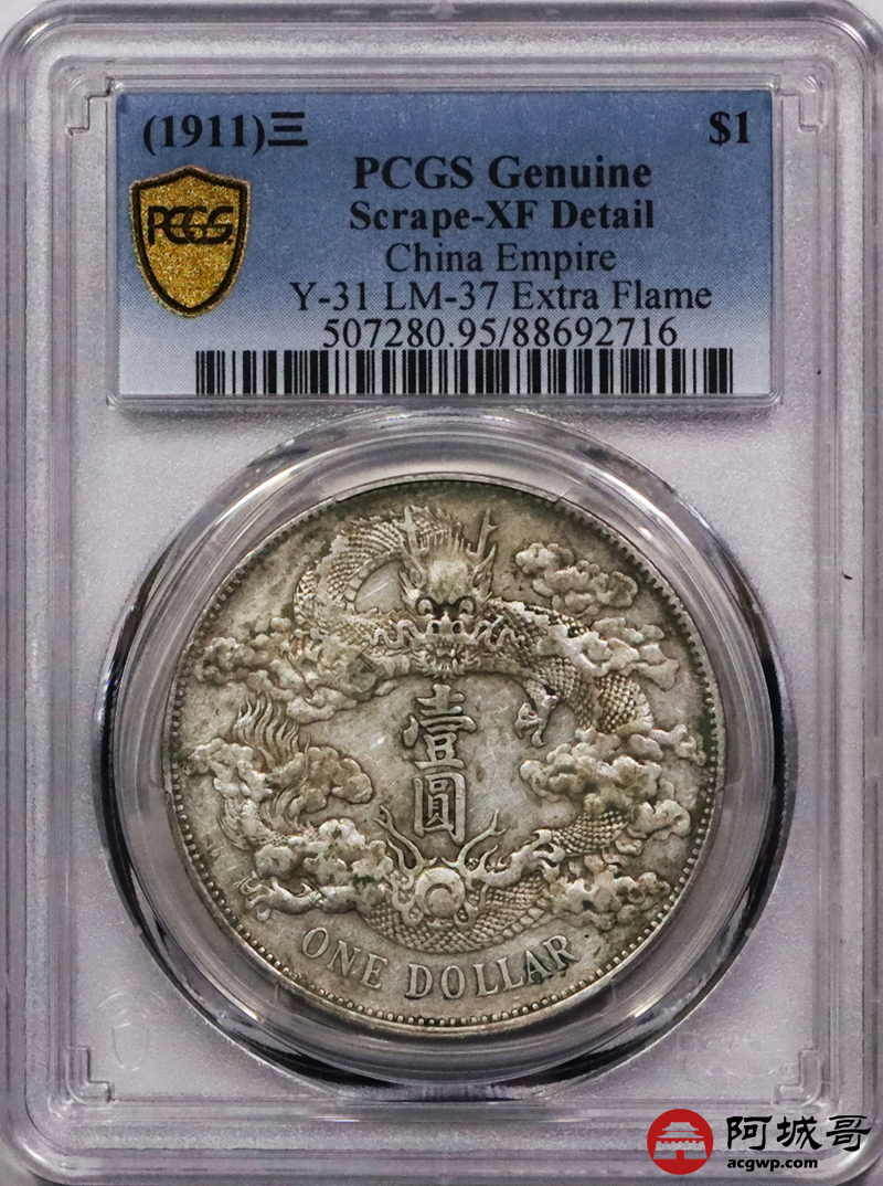 Lot:3056 1911宣统三年大清壹圆银币一枚,原汁原味 PCGS XF