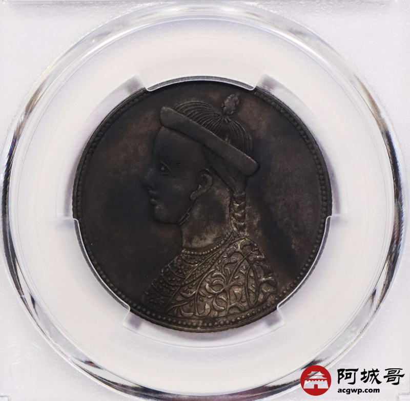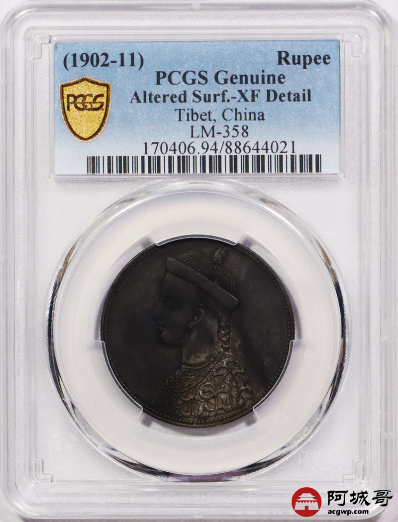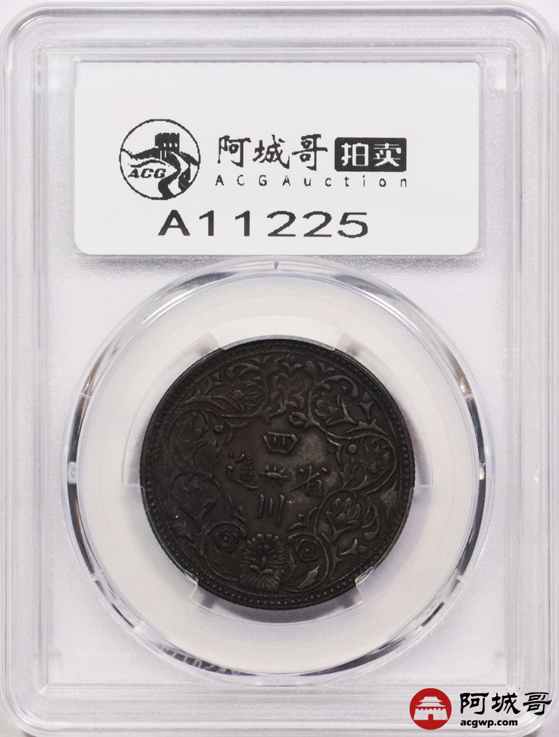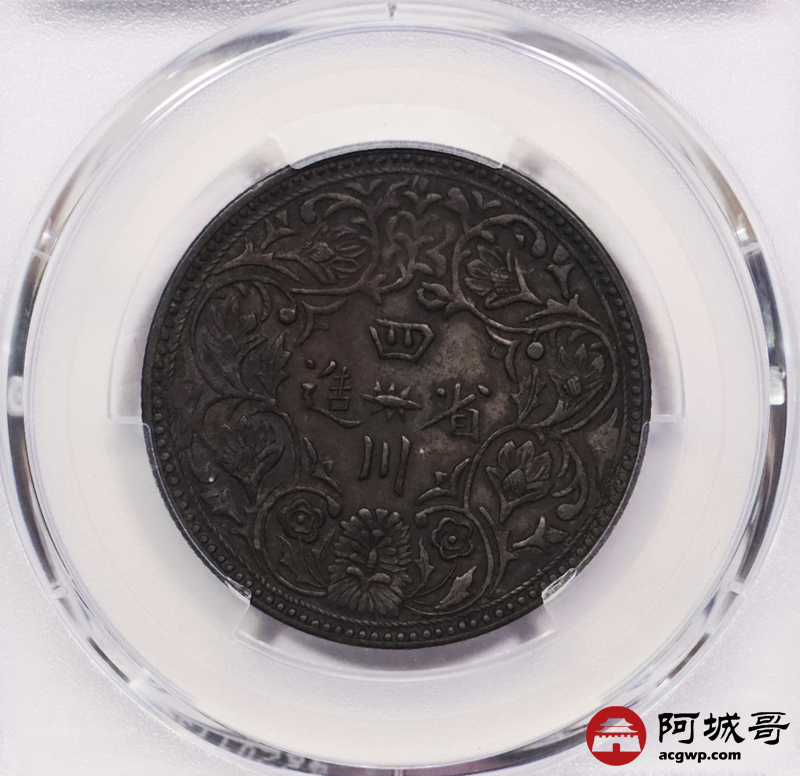 Lot:3585 1902-11四川省造卢比银币一枚无领横花,酱彩包浆PCGS XF评级编号:88644021