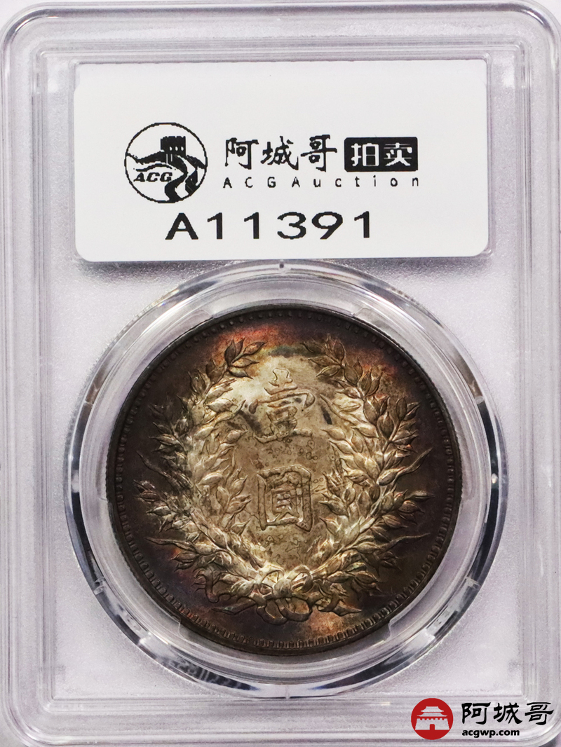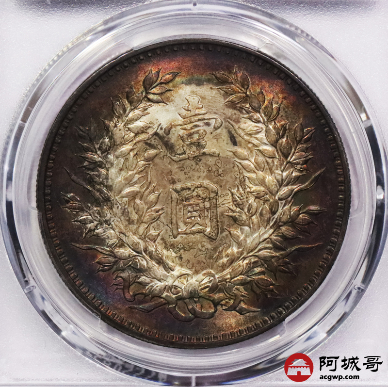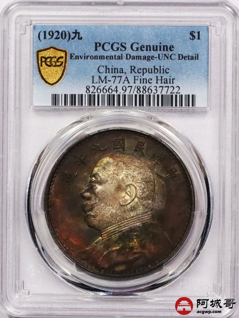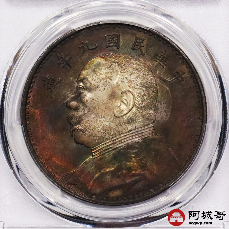 Lot:3524 1920民国九年袁世凯像壹圆银币一枚,精发版,五彩包浆PCGS UNC评级编号:88637722