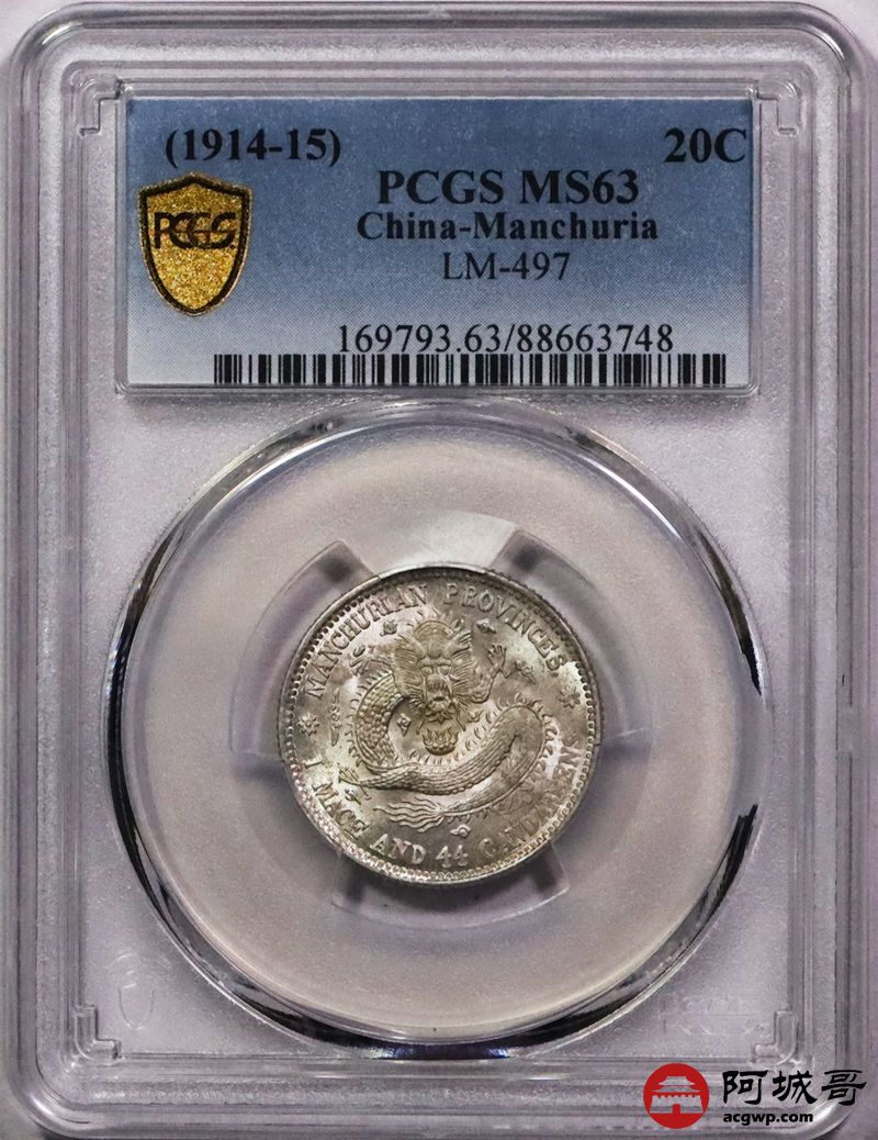 Lot:3611 1914-15东三省造宣统元宝库平一钱四分四厘银币一枚,原光深打满龙鳞PCGS MS63评级编号:88663748