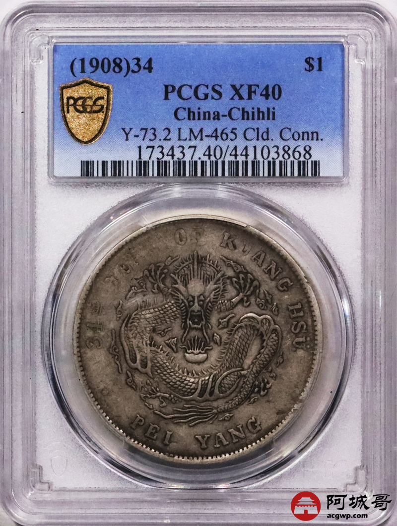 Lot:3313 1908光绪三十四年北洋造光绪元宝库平七钱二分银币一枚,原汁原味PCGS XF40评级编号:44103868