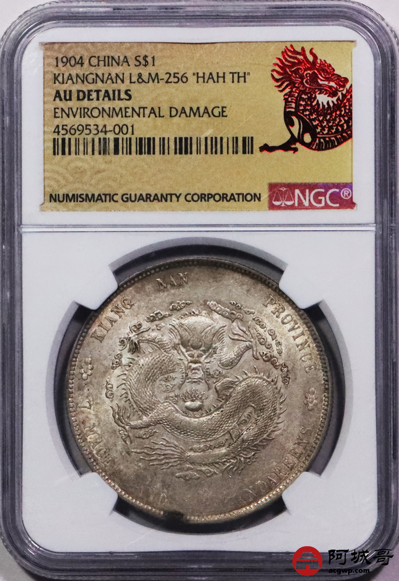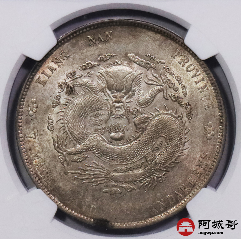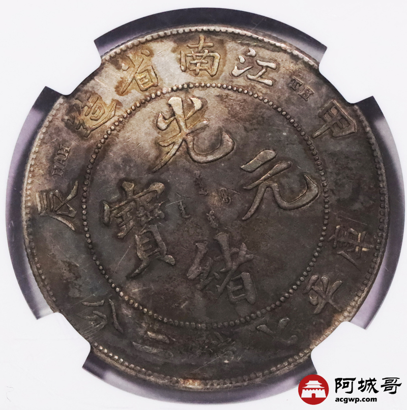 Lot:3379 1904甲辰年江南省造光绪元宝库平七钱二分银币一枚,五彩包浆 NGC AU评级编号:4569534-001