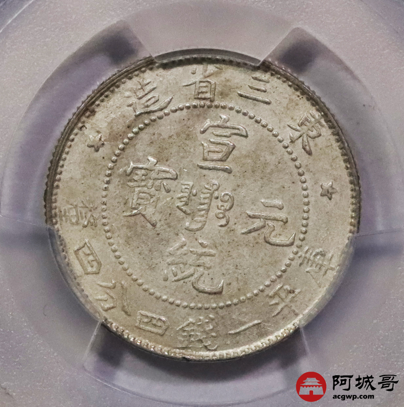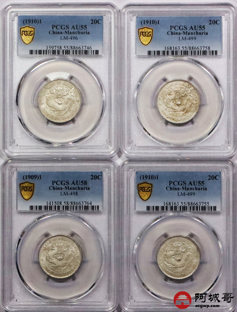 Lot:3620 1910东三省造光绪元宝库平一钱四分四厘银币4枚,原光满龙鳞PCGS AU55/AU55/AU55/AU58评级编号:88663755-88663746-88663758-88663764