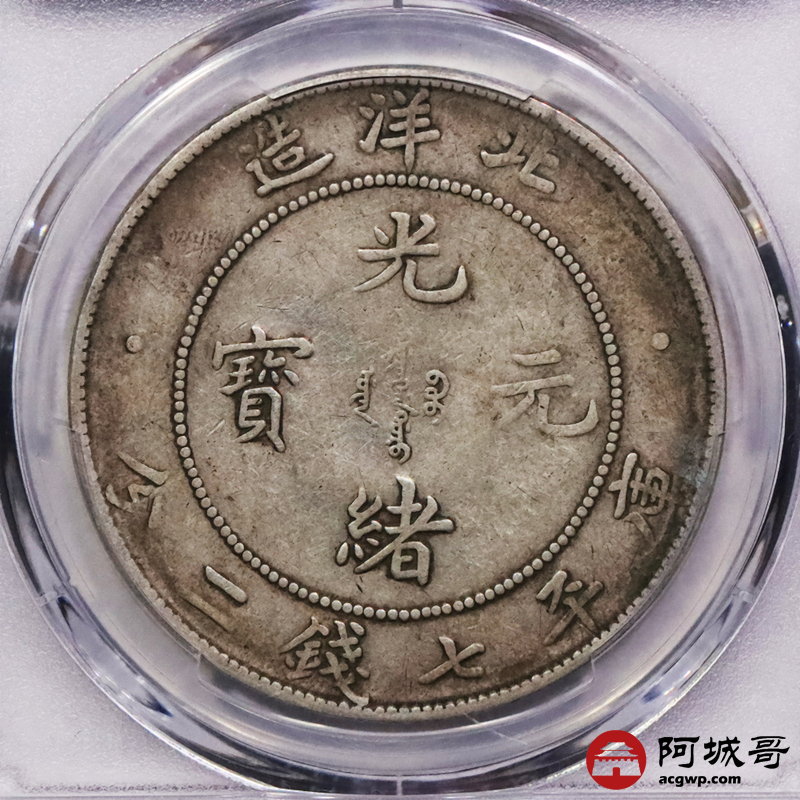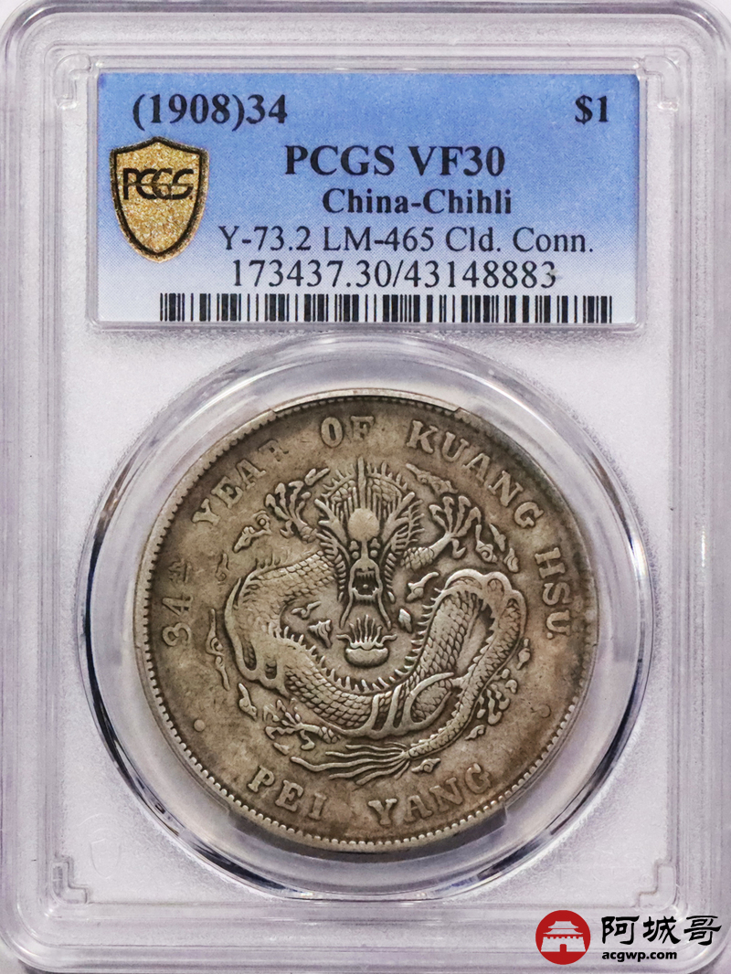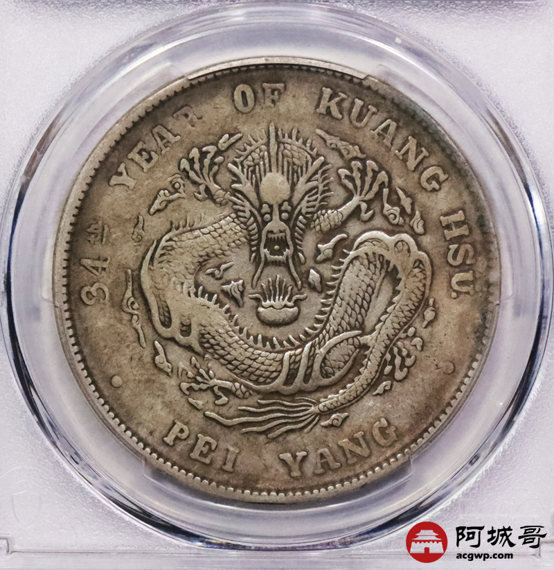 Lot:3332 1908光绪三十年北洋造光绪元宝库平七钱二分银币一枚,原味老包浆PCGS VF30评级编号:43148883