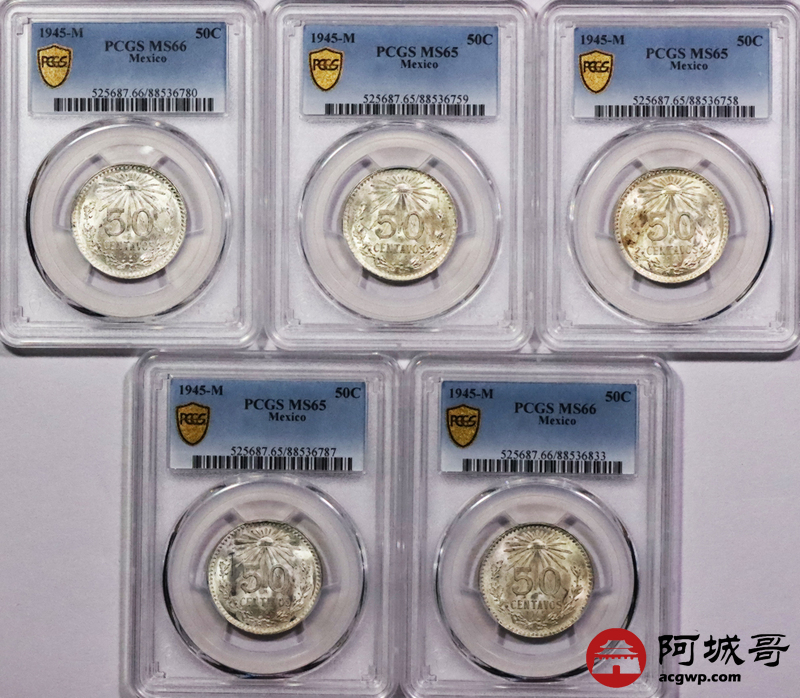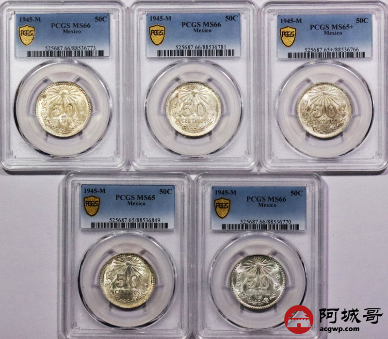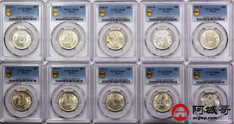 Lot:3767 1945墨西哥鹰洋50C银币十枚一组,PCGS MS65 65+ 66