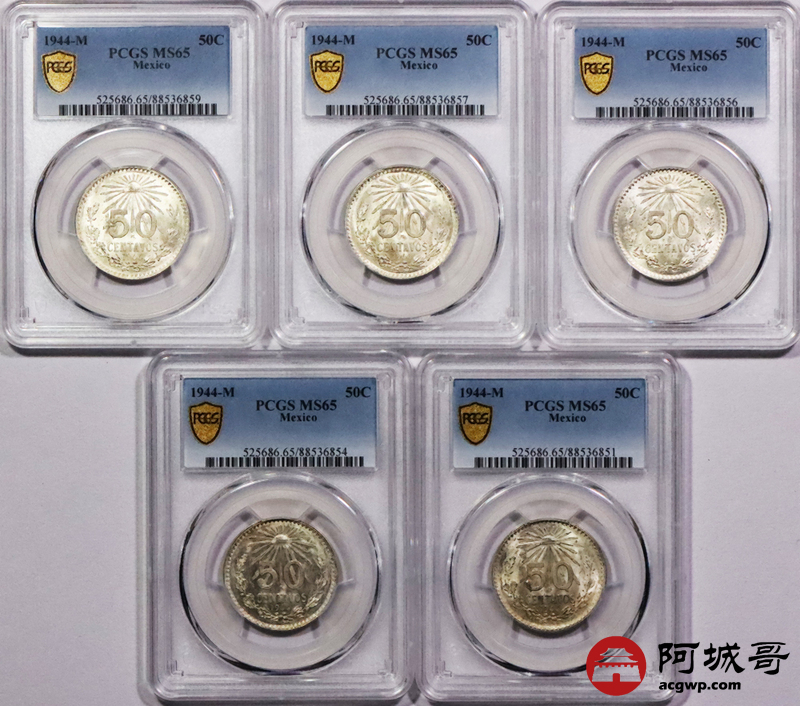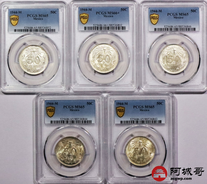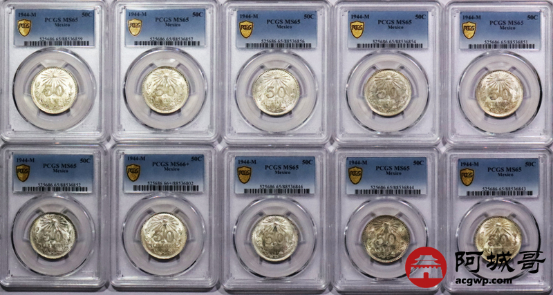 Lot:3766 1944墨西哥鹰洋50C银币十枚一组,PCGS MS64 65 66+