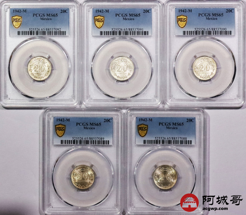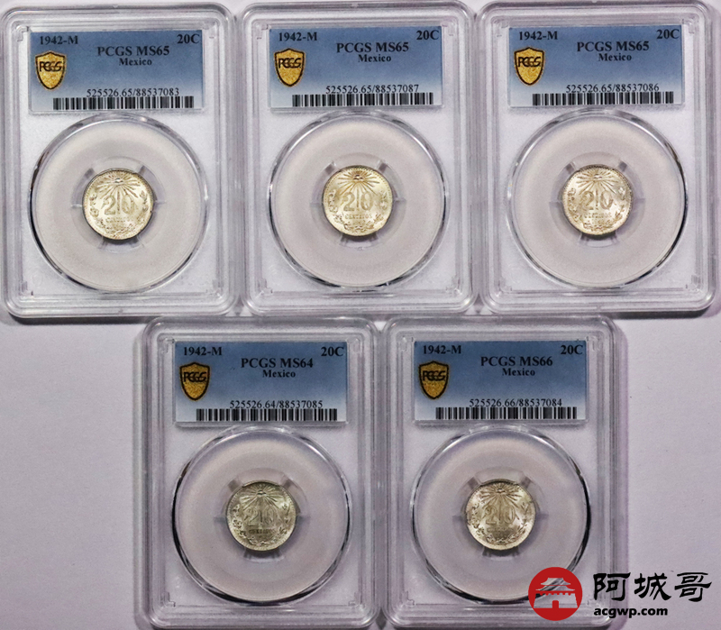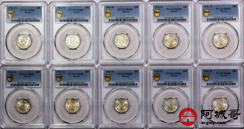 Lot:3771 1942墨西哥鹰洋20C银币十枚一组,PCGS MS64 65 66