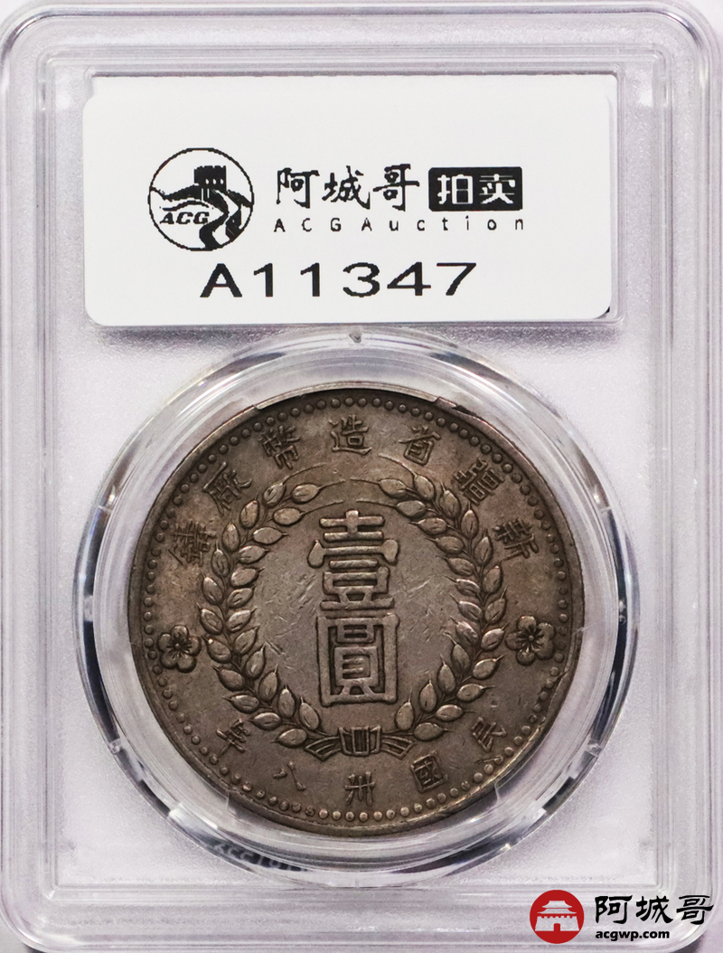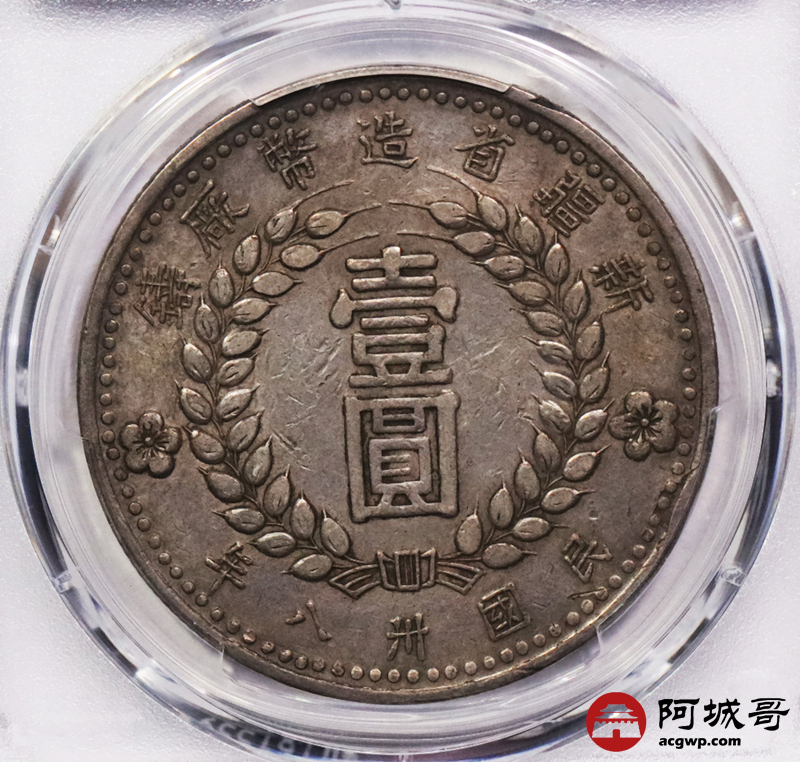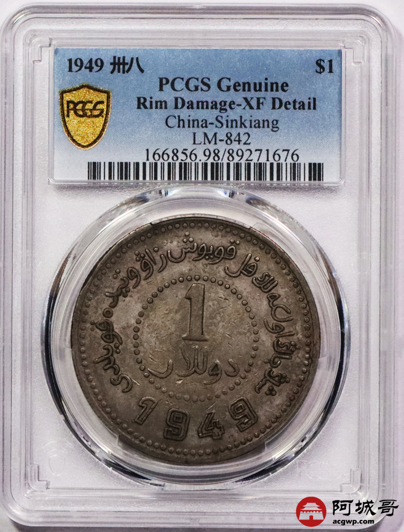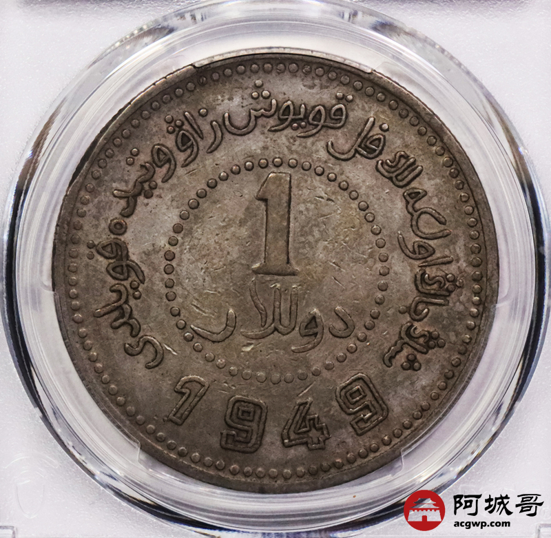 Lot:3455 1949民国三十八年新疆省造币厂铸壹圆银币一枚,字口深打,原味包浆PCGS XF评级编号:89271676