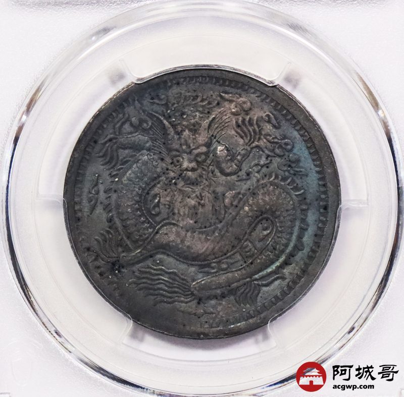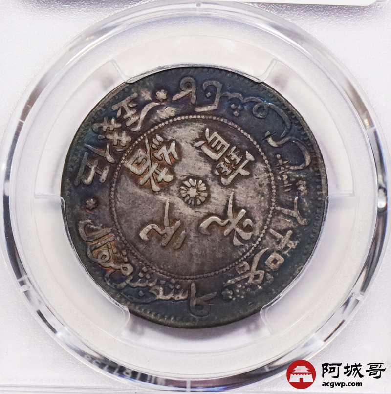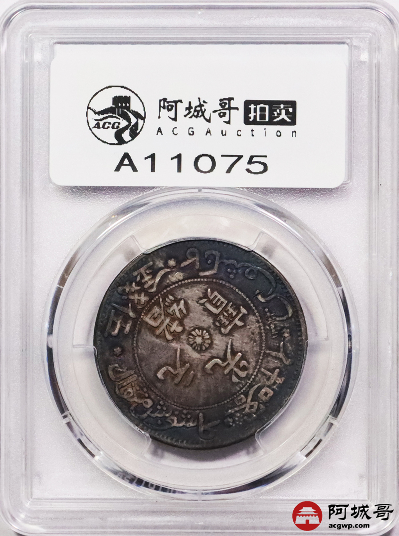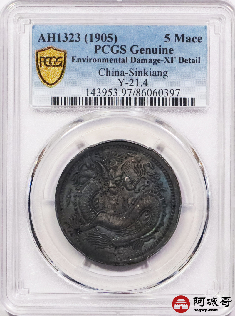 Lot:3447 AH1323(1905)光绪年新疆造光绪元宝伍钱银币一枚,五彩包浆PCGS XF评级编号:86060397