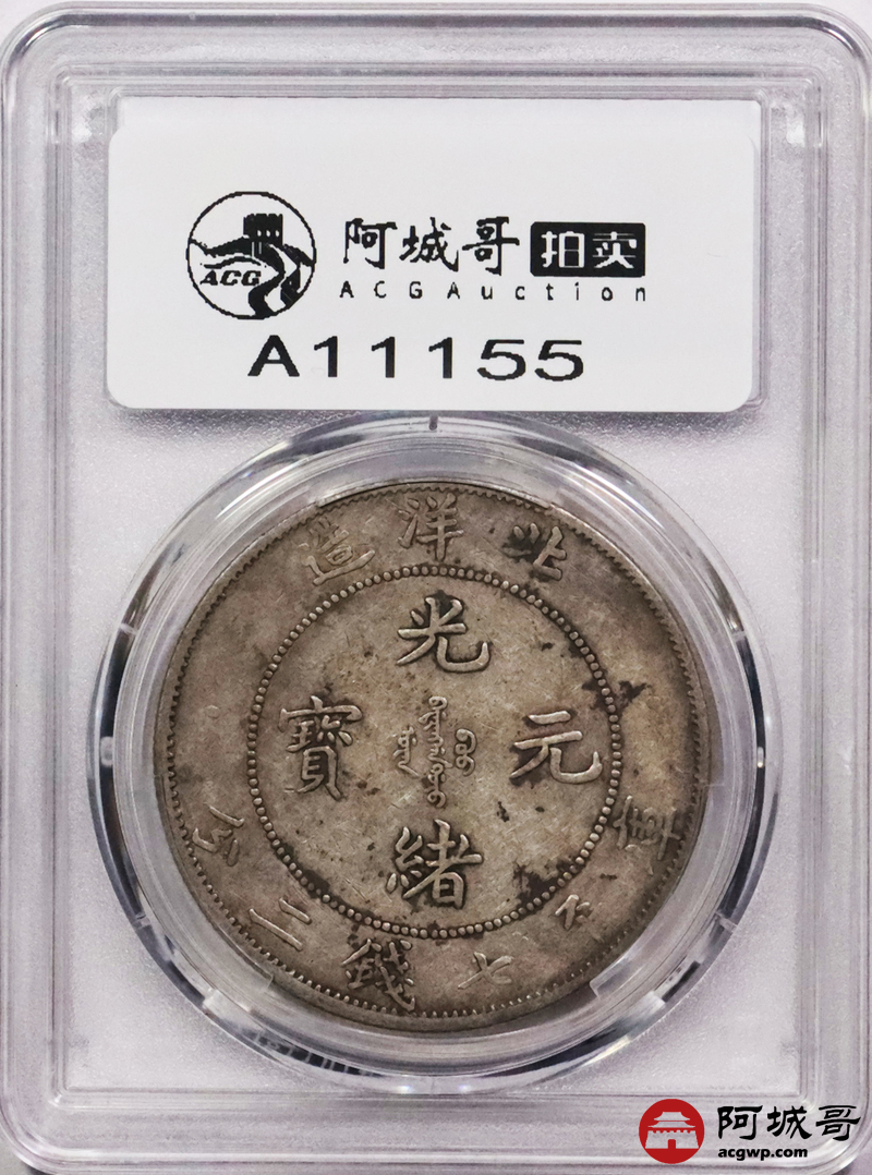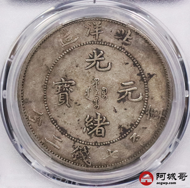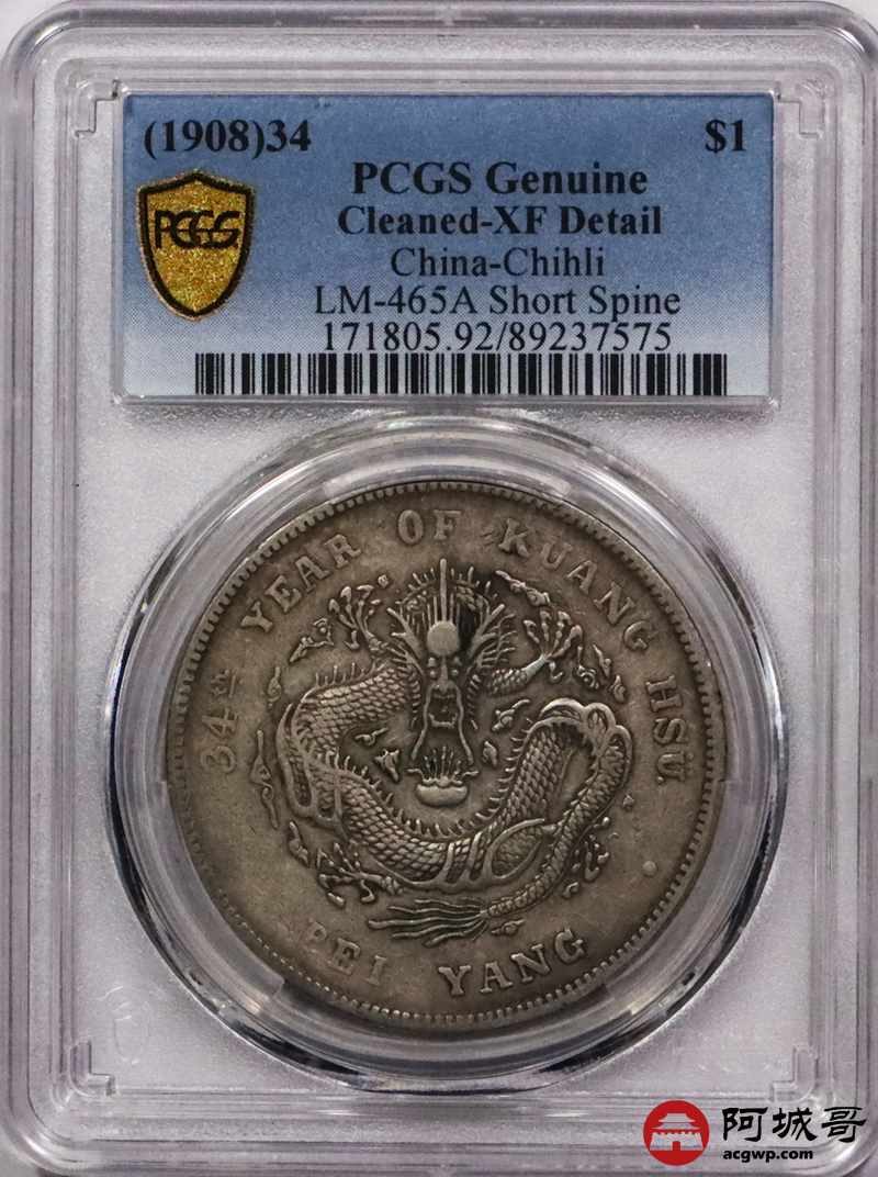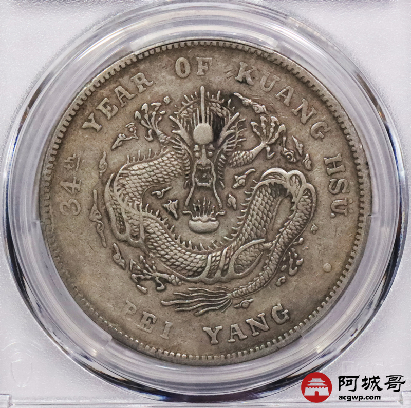 Lot:3324 1908光绪三十年北洋造光绪元宝库平七钱二分银币一枚,原味老包浆,短尾版PCGS XF评级编号:89237575