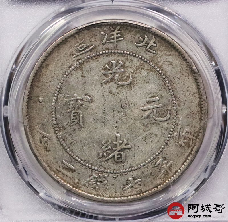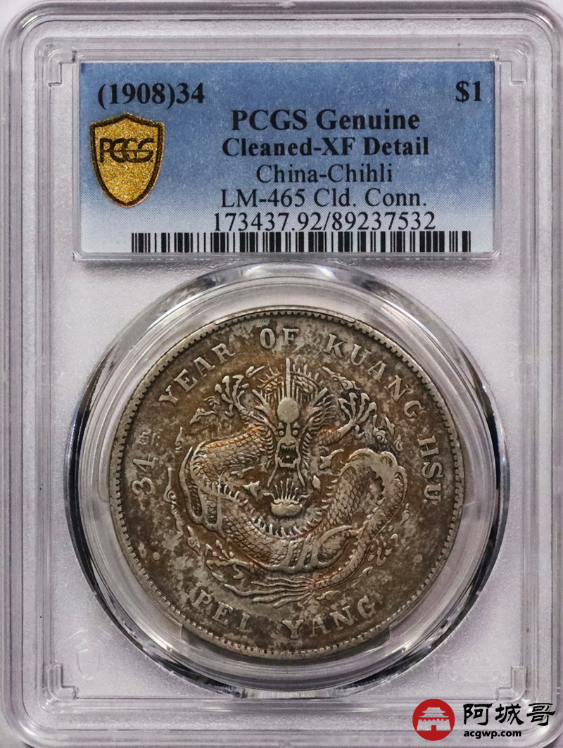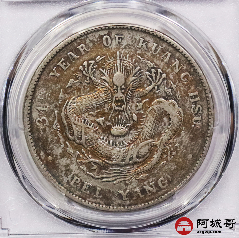 Lot:3340 1908光绪三十年北洋造光绪元宝库平七钱二分银币一枚,原味五彩包浆PCGS XF评级编号:89237532