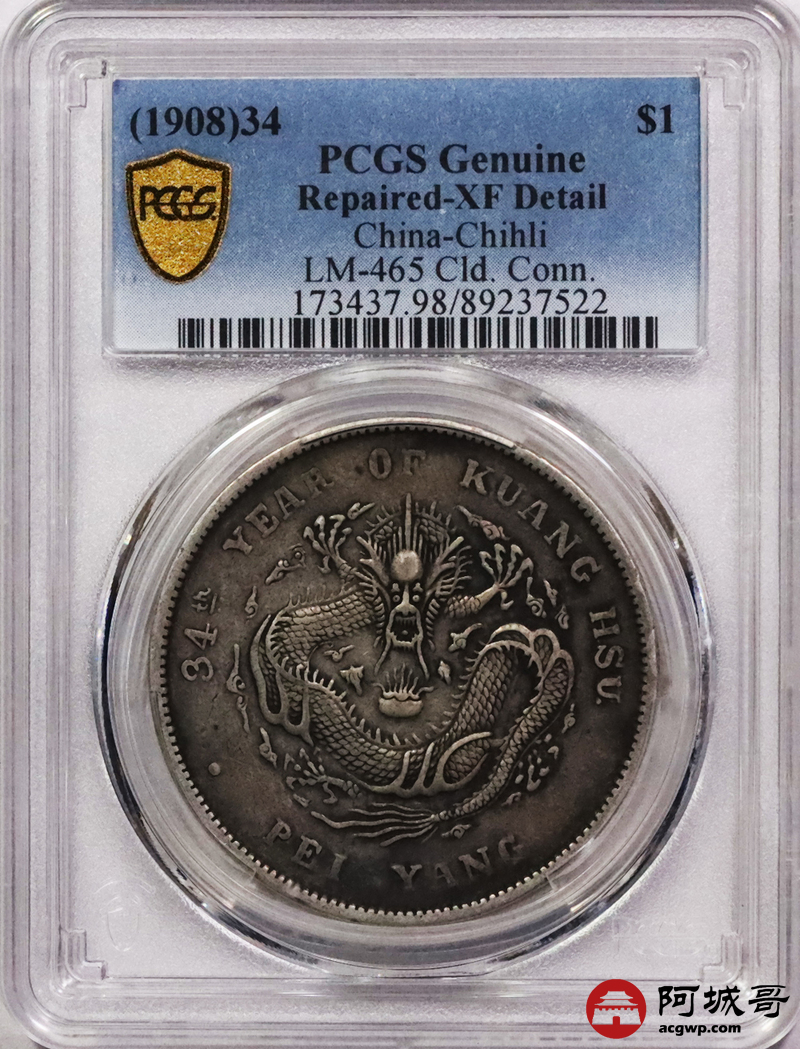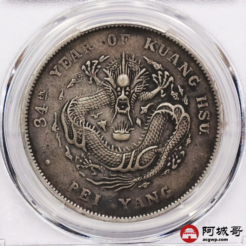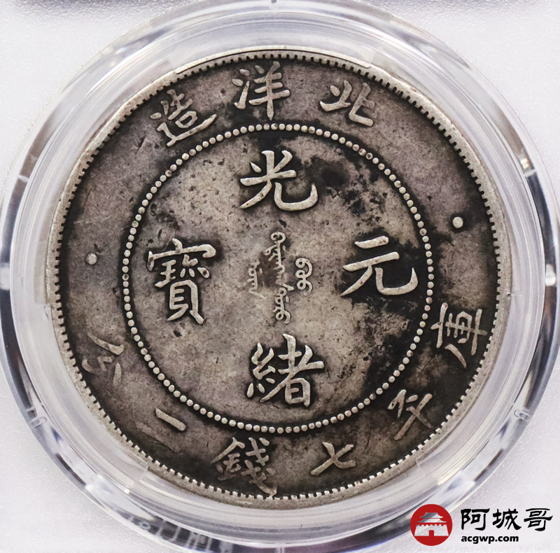 Lot:3335 1908光绪三十年北洋造光绪元宝库平七钱二分银币一枚,原味老包浆PCGS XF评级编号:89237522