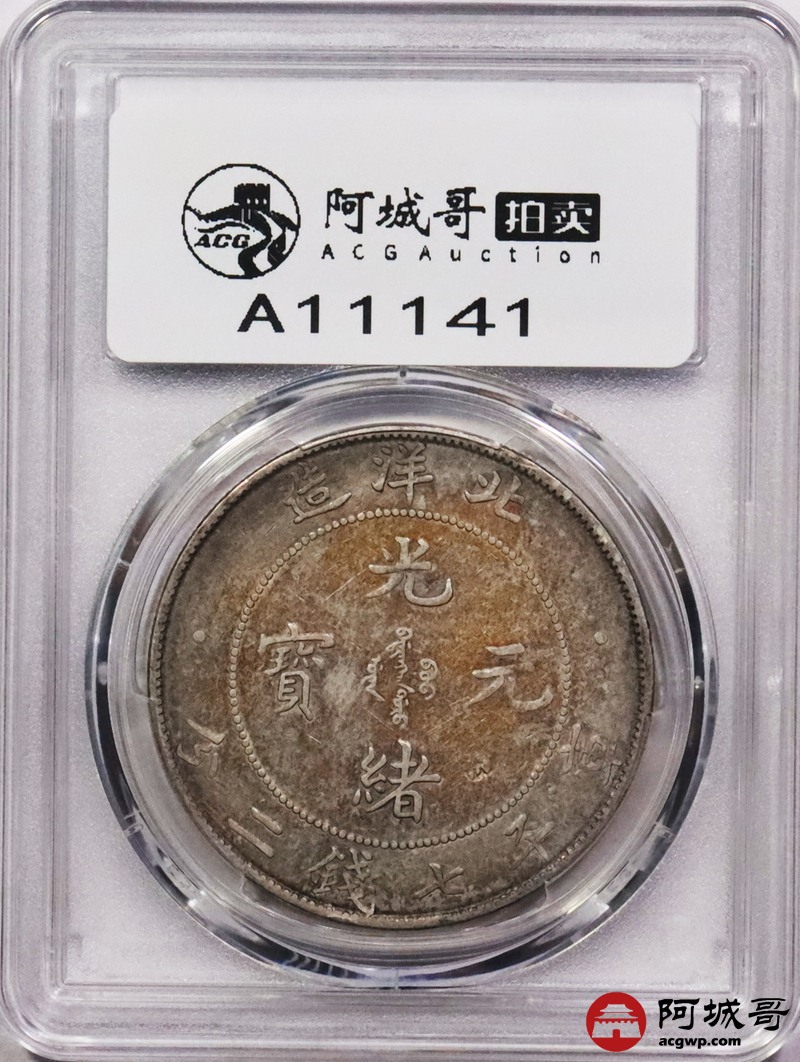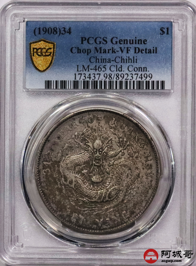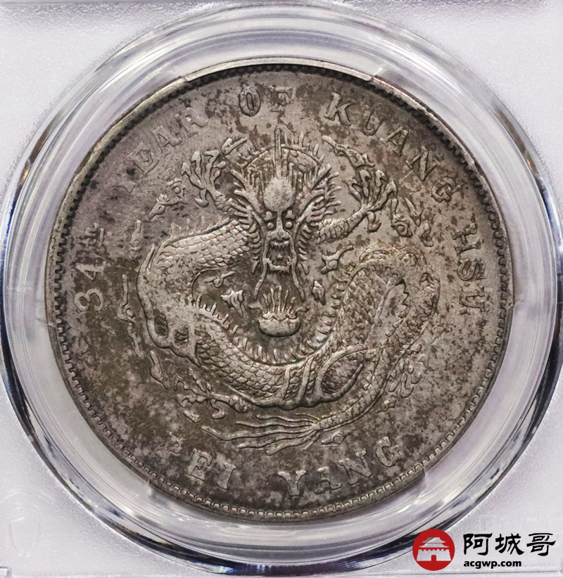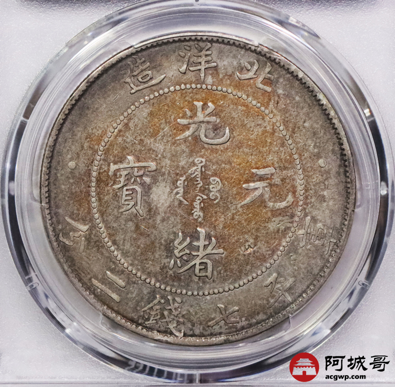 Lot:3323 1908光绪三十四年北洋造光绪元宝库平七钱二分银币一枚,原味五彩PCGS VF评级编号:89237499