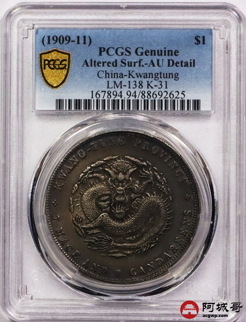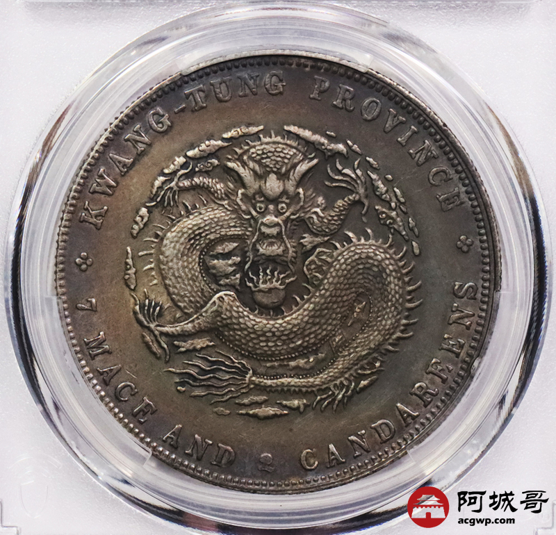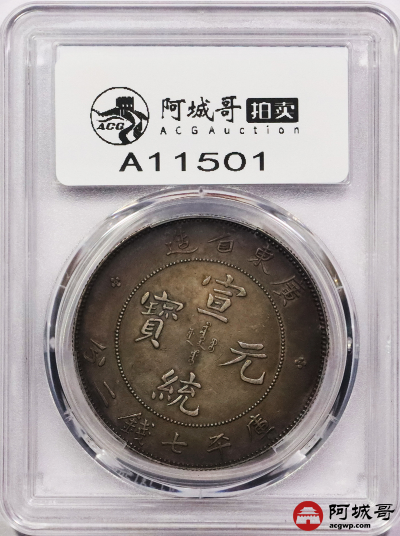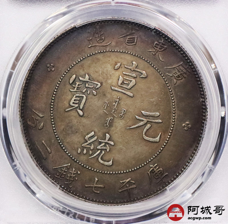 Lot:3388 1909-11广东省造宣统元宝库平七钱二分银币一枚,五彩包浆PCGS AU评级编号:88692625