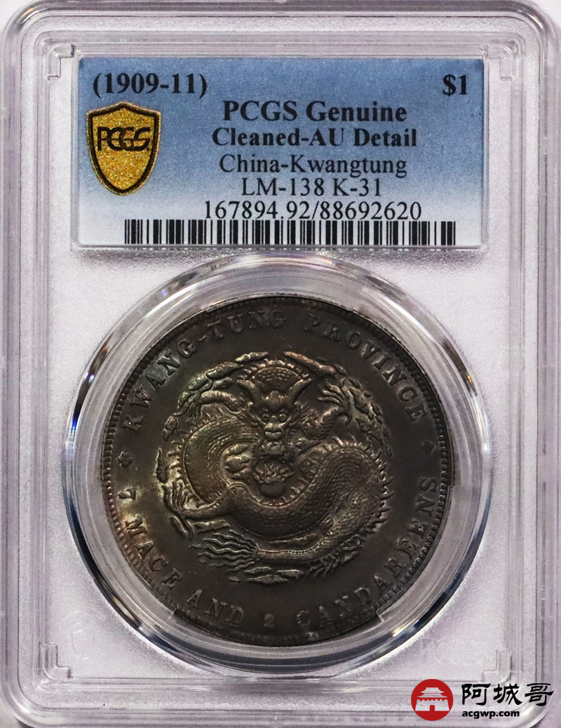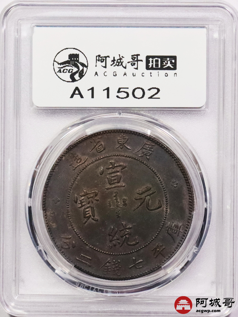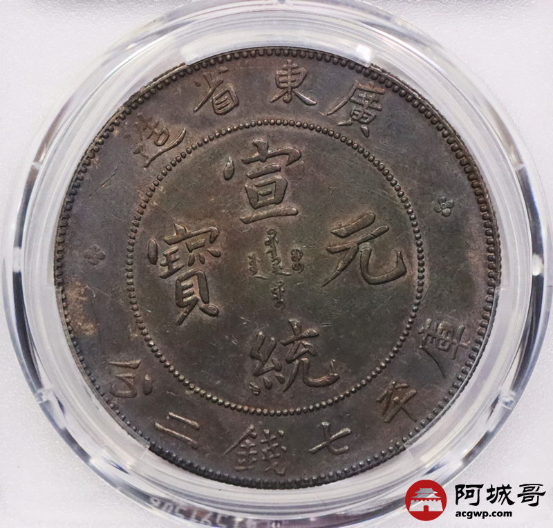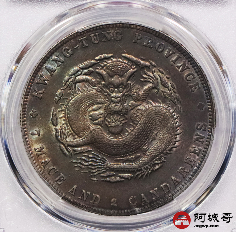 Lot:3389 1909-11广东省造宣统元宝库平七钱二分银币一枚,五彩包浆PCGS AU评级编号:88692620