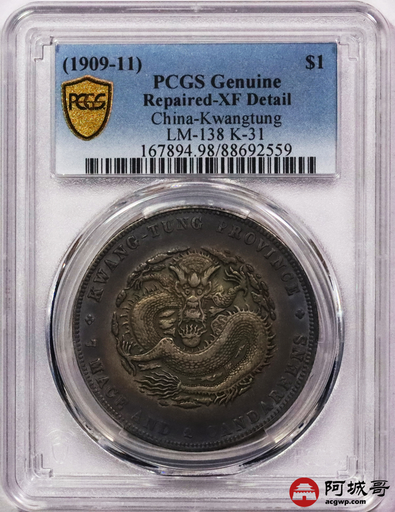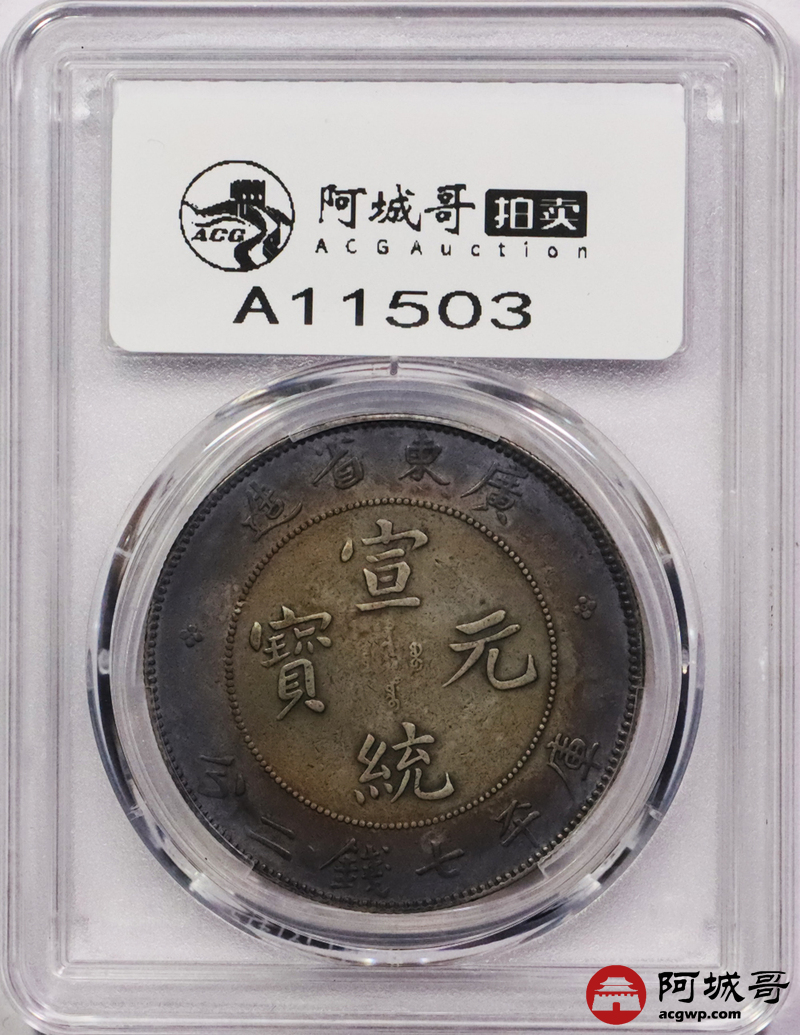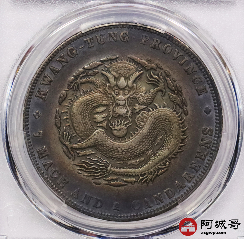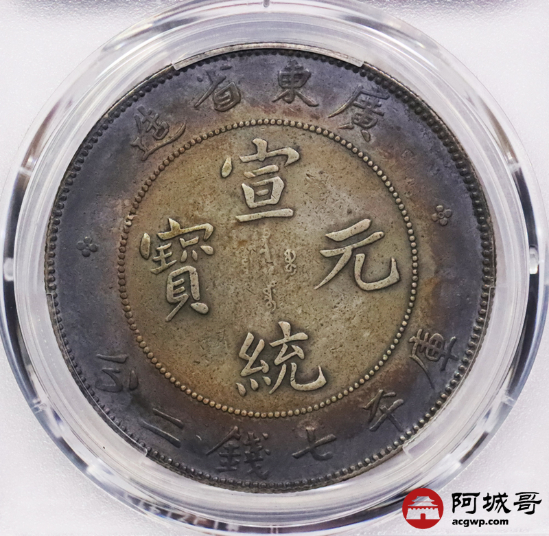 Lot:3390 1909-11广东省造宣统元宝库平七钱二分银币一枚,五彩包浆PCGS XF评级编号:88692559