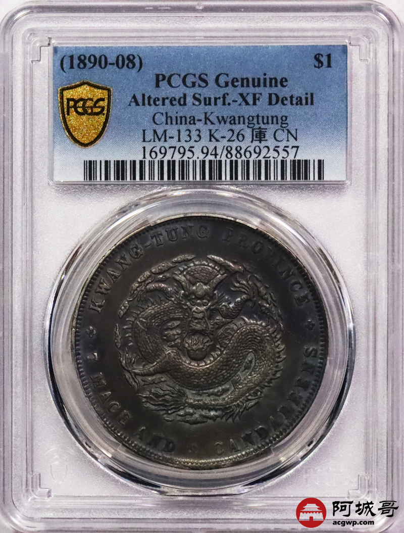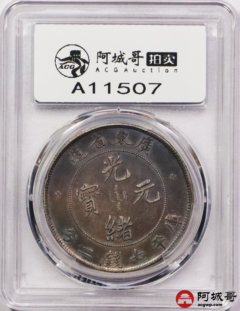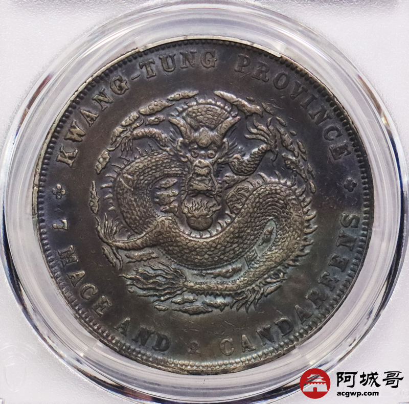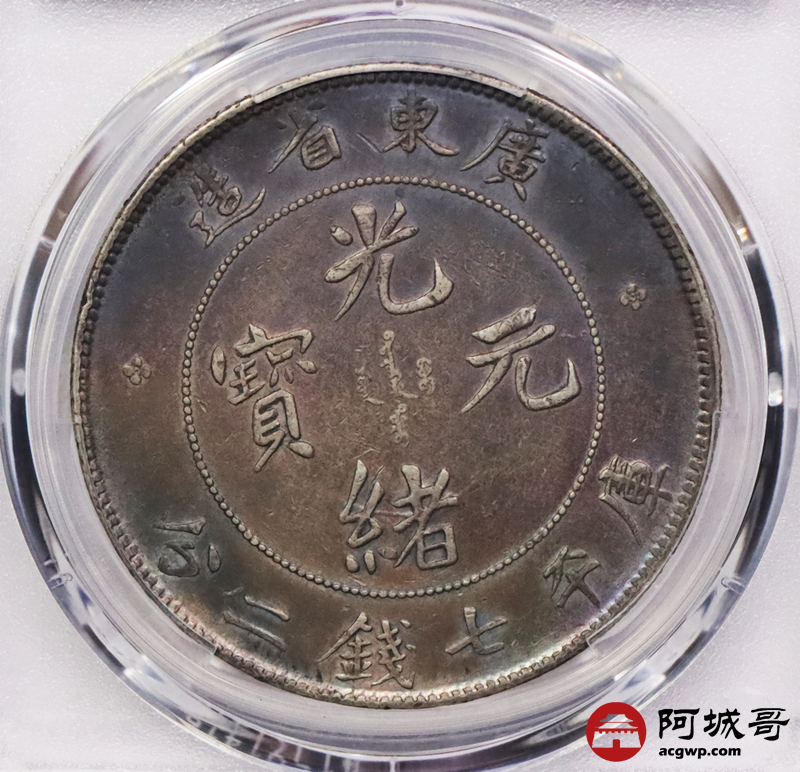 Lot:3384 1890-08广东省造光绪元宝库平七钱二分银币一枚,氧化五彩包浆PCGS XF评级编号:88692557