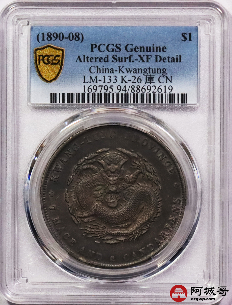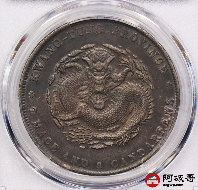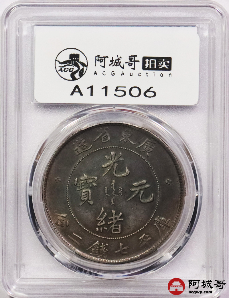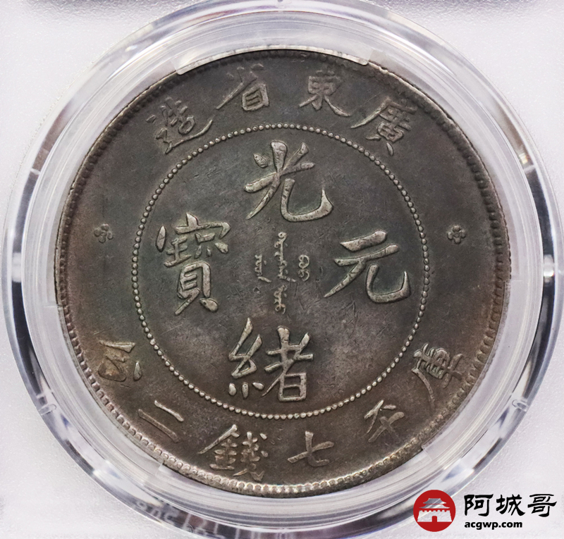 Lot:3385 1890-08广东省造光绪元宝库平七钱二分银币一枚,氧化五彩包浆PCGS XF评级编号:88692619