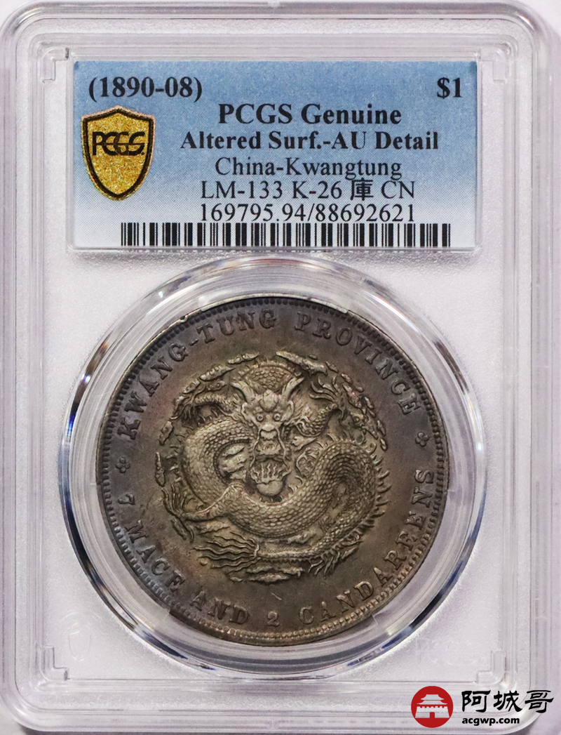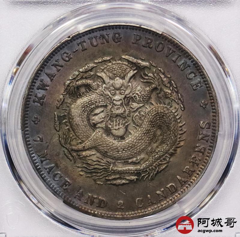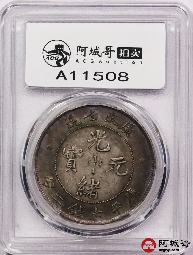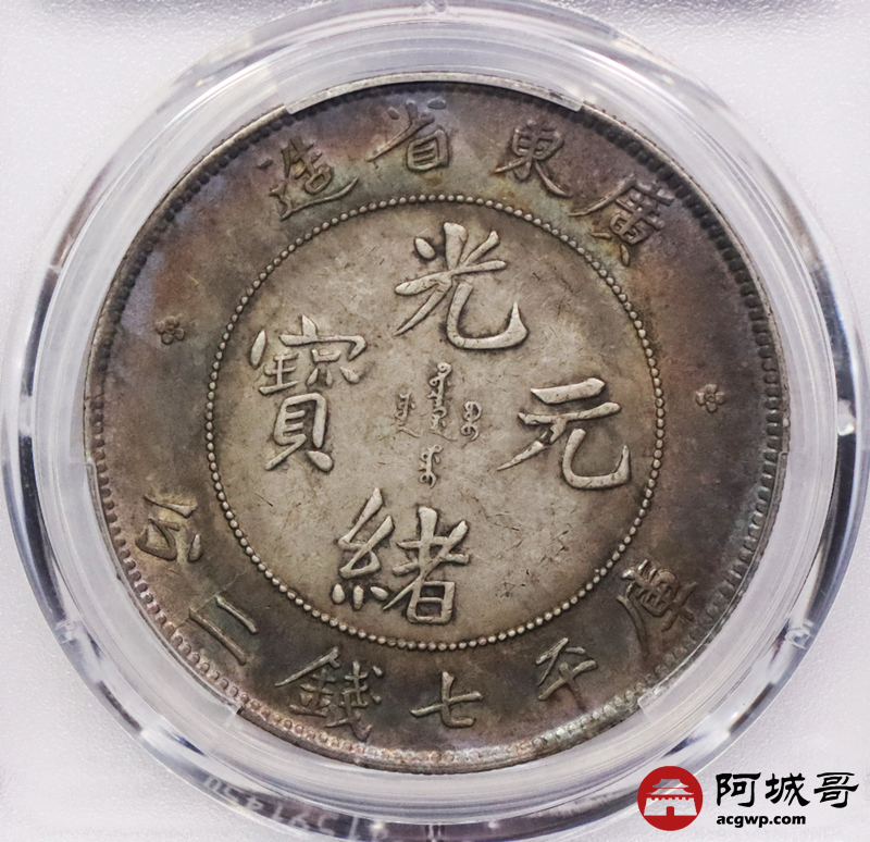 Lot:3383 1890-08广东省造光绪元宝库平七钱二分银币一枚,氧化五彩包浆PCGS XF评级编号:88692621