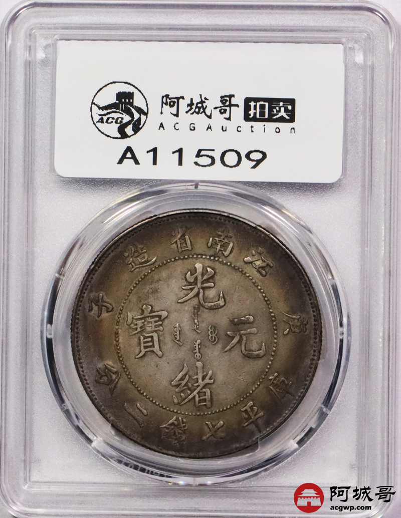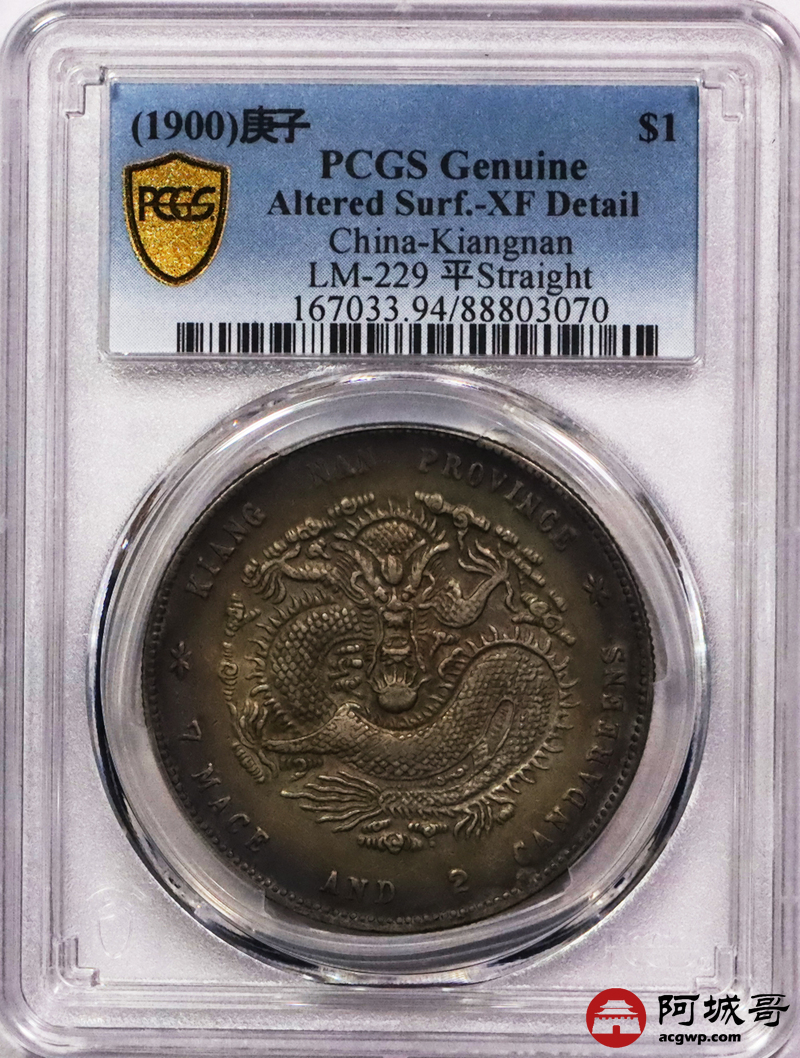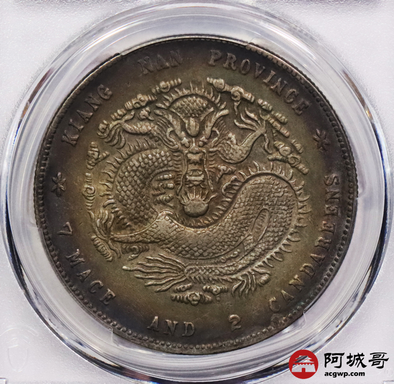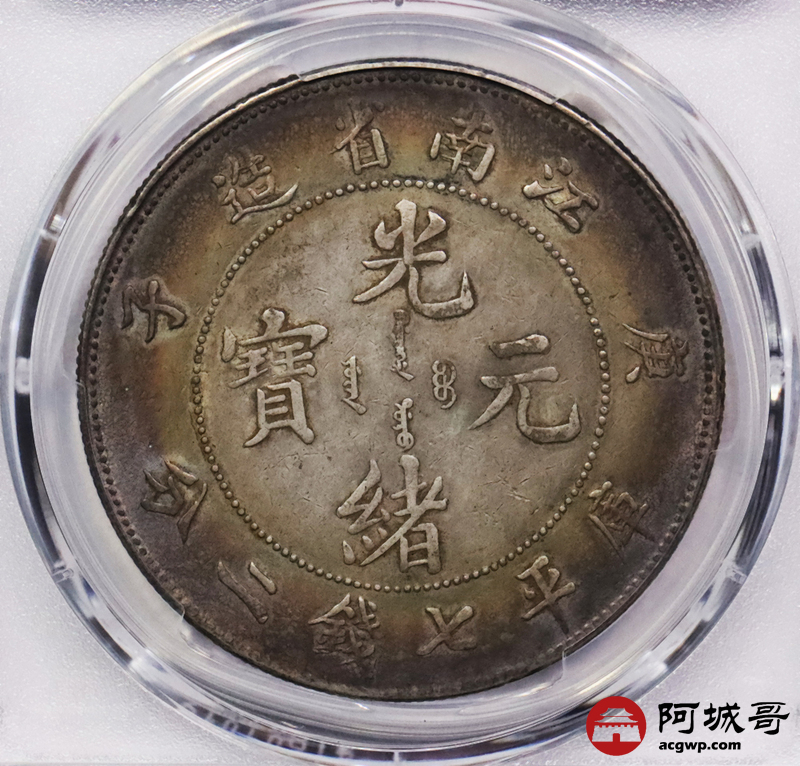 Lot:3363 1900庚子年江南省造光绪元宝库平七钱二分银币一枚,五彩包浆PCGS XF评级编号:88803070