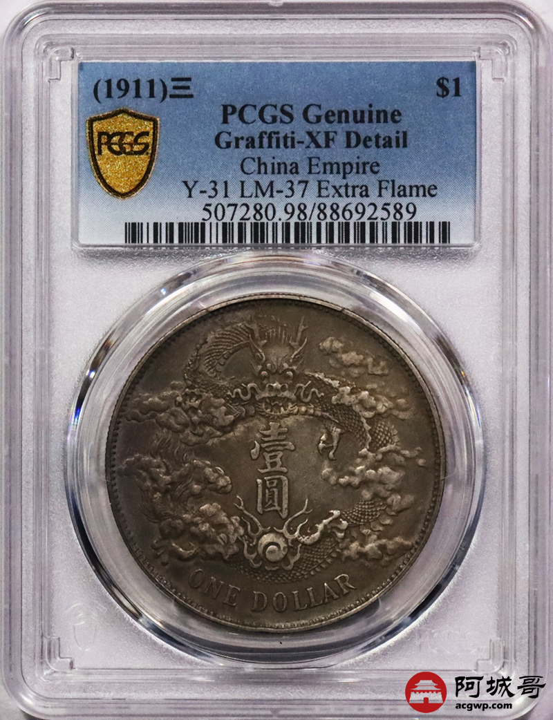 Lot:3053 1911宣统三年大清银币壹圆一枚,原味酱彩包浆 PCGS XF
