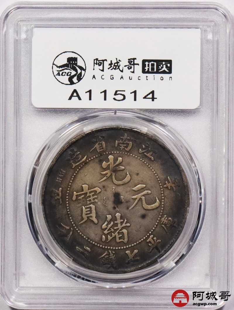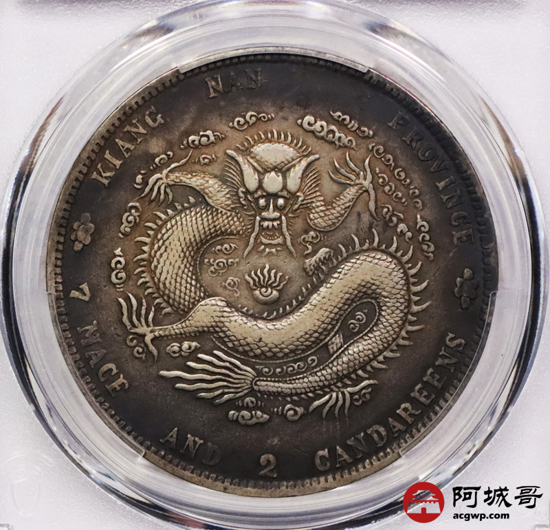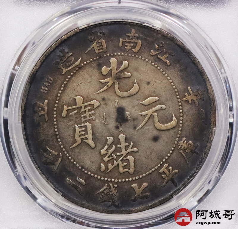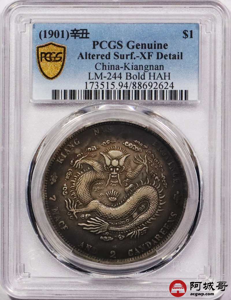 Lot:3368 1901辛丑年江南省造光绪元宝库平七钱二分银币一枚,五彩包浆 PCGS XF评级编号:88692624