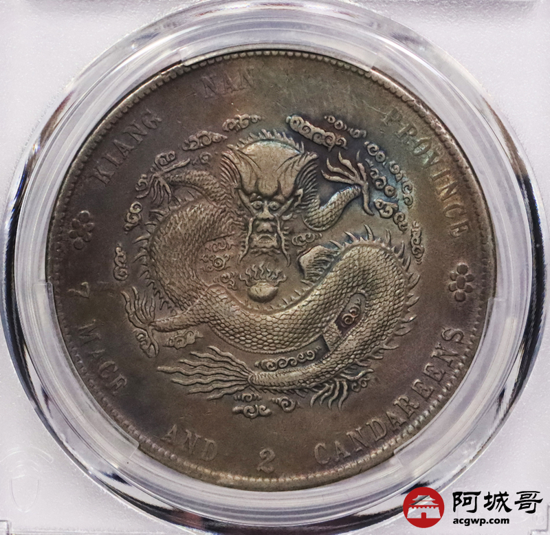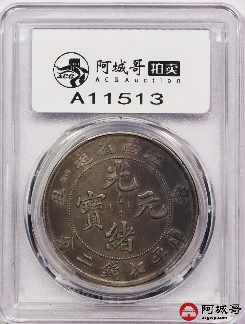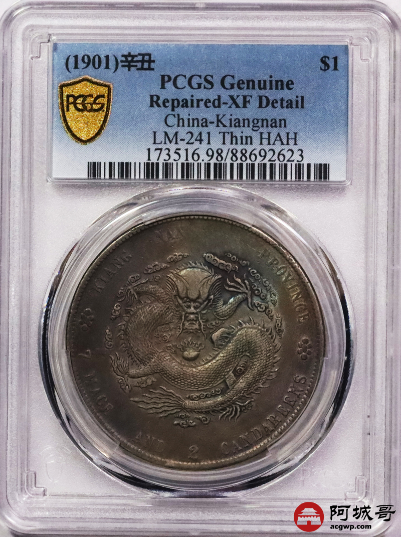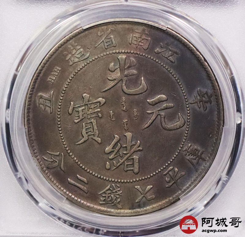 Lot:3369 1901辛丑年江南省造光绪元宝库平七钱二分银币一枚,五彩包浆 PCGS XF评级编号:88692623
