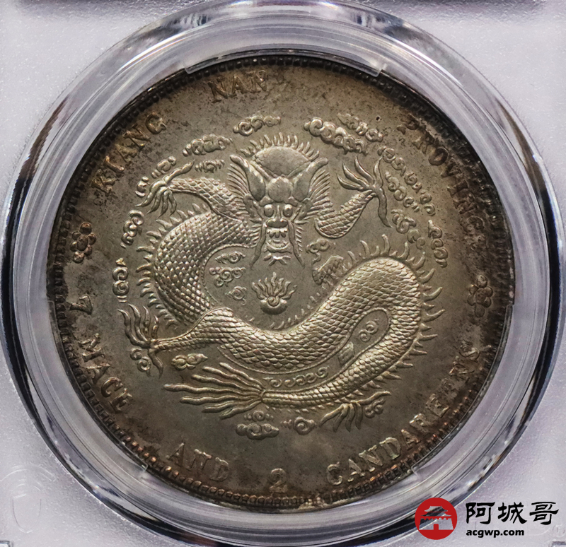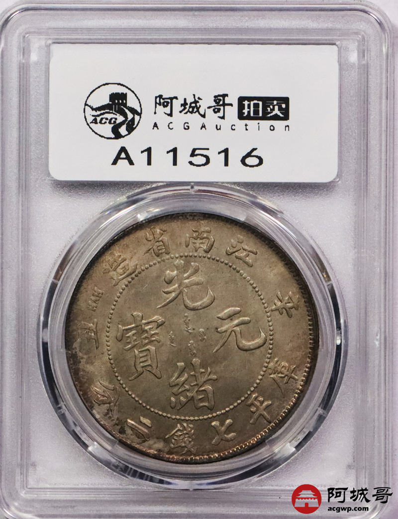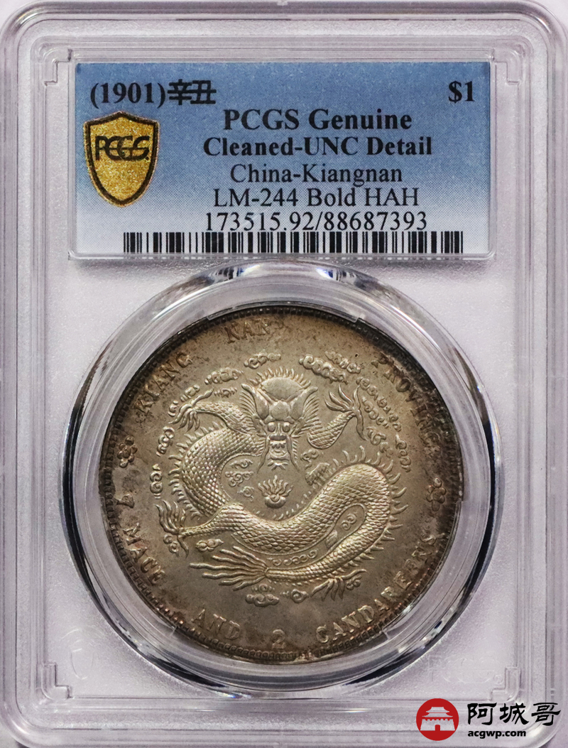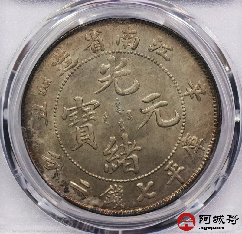 Lot:3366 1901辛丑年江南省造光绪元宝库平七钱二分银币一枚,黄油原光,五彩包浆 PCGS UNC评级编号:88687393