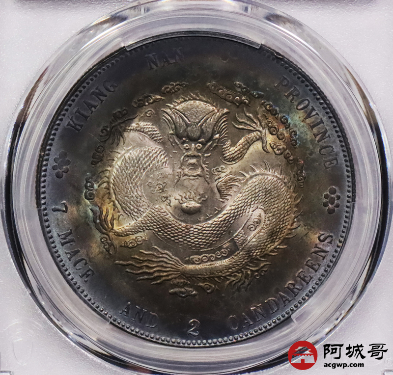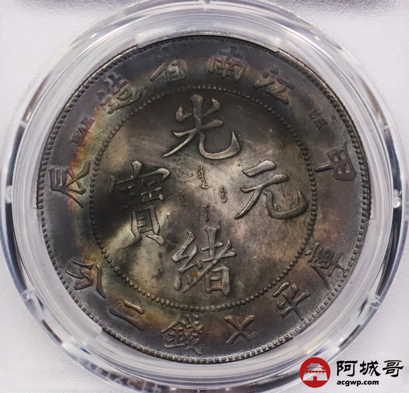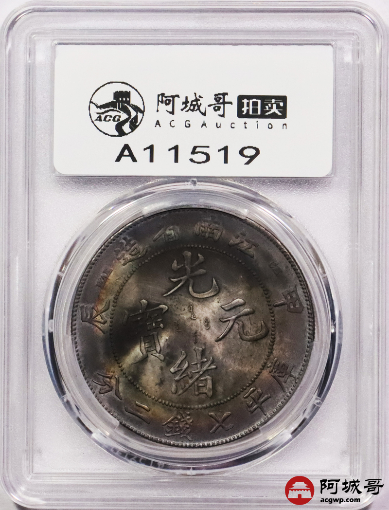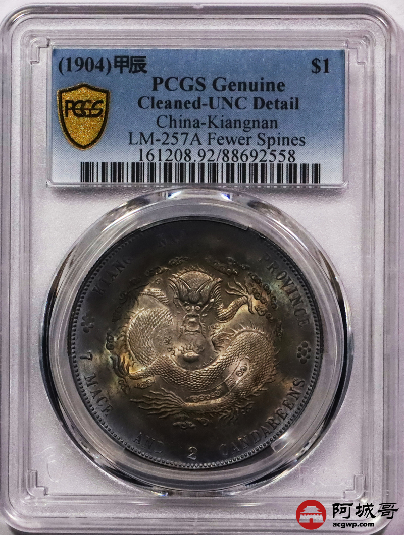 Lot:3377 1904江南省造甲辰年光绪元宝库平七钱二分银币一枚,原光五彩包浆PCGS UNC评级编号:88692558