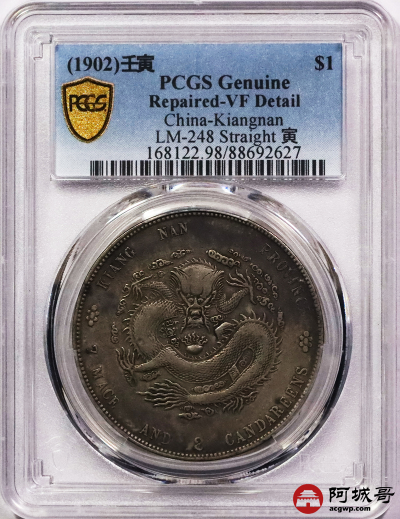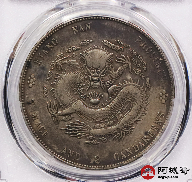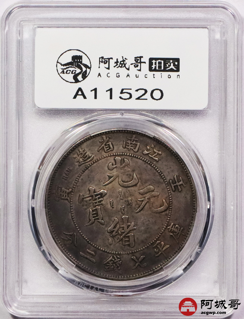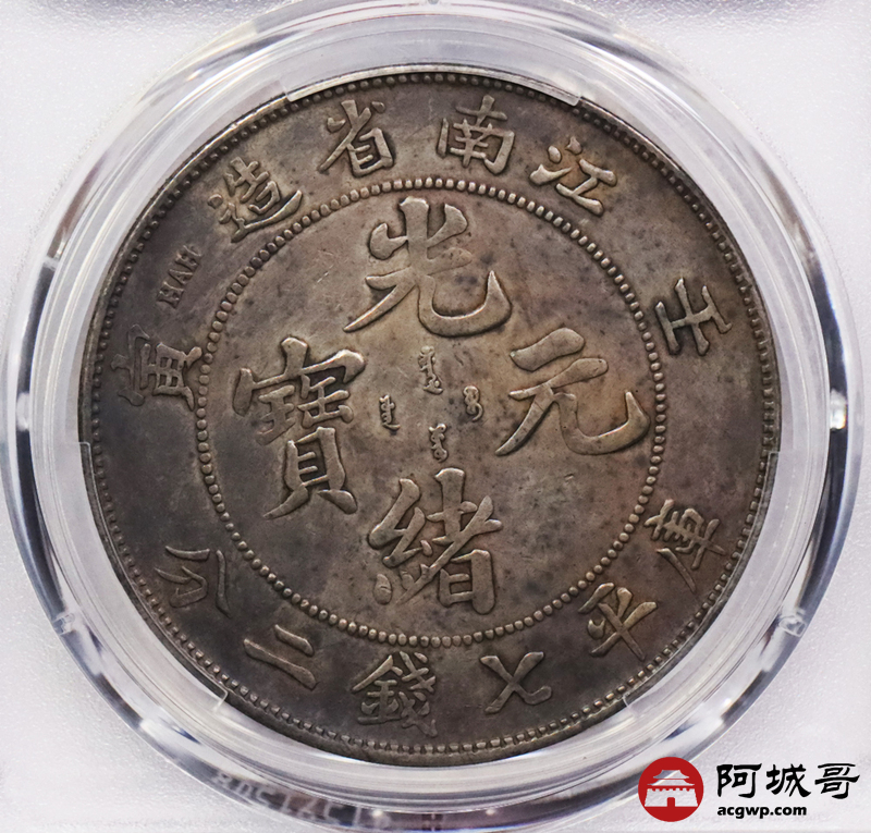 Lot:3373 1902壬寅年江南省造光绪元宝库平七钱二分银币一枚,原味酱彩包浆 PCGS VF