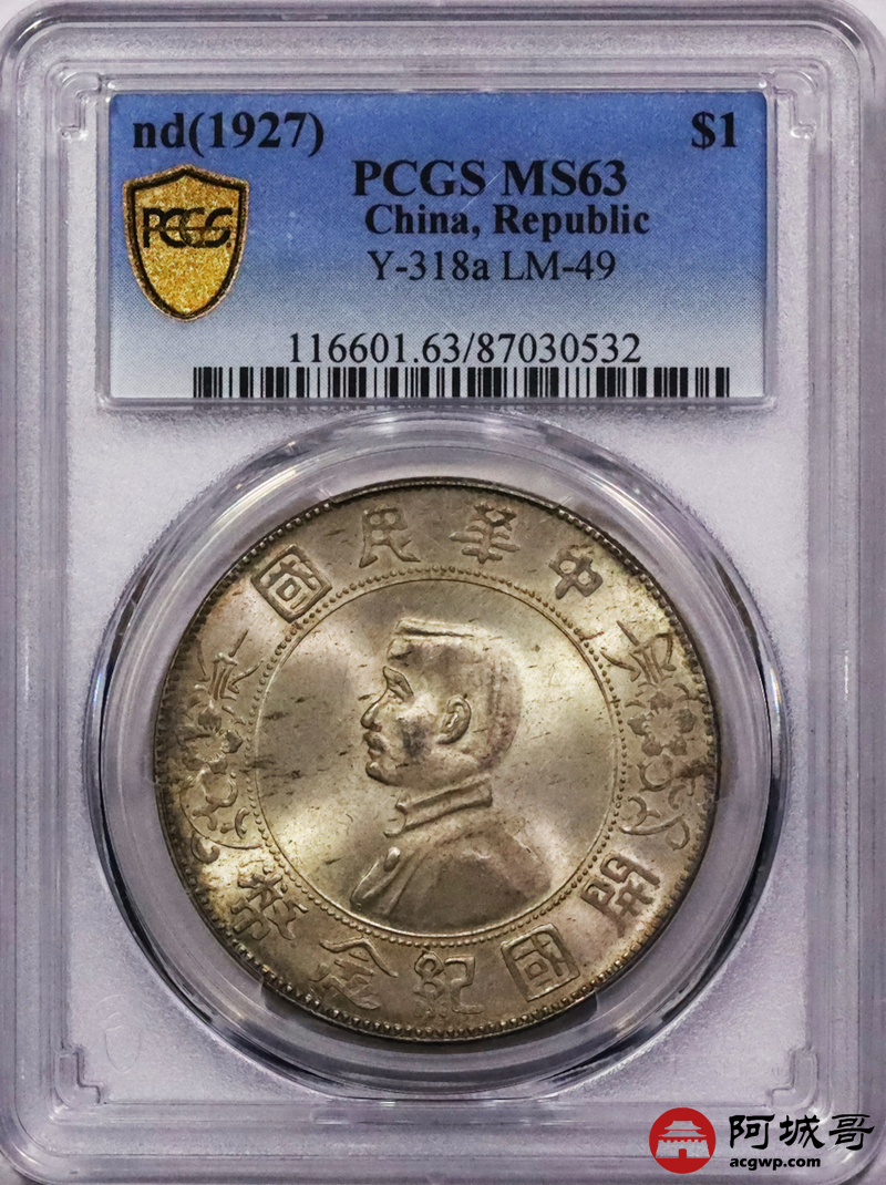 Lot:3109 1927孙中山像开国纪念币壹圆银币一枚,黄油转光 PCGS MS63评级编号:87030532