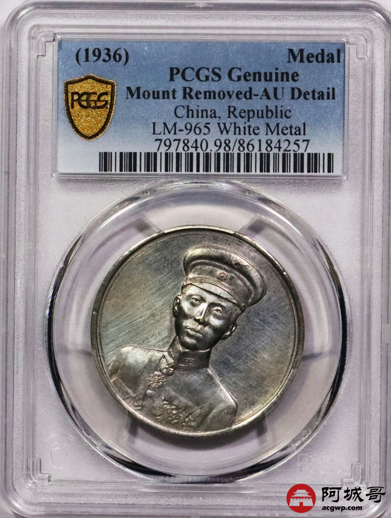 Lot:3216 1936年张学良增合金纪念章一枚,底板深打,细节保存完好 PCGS AU