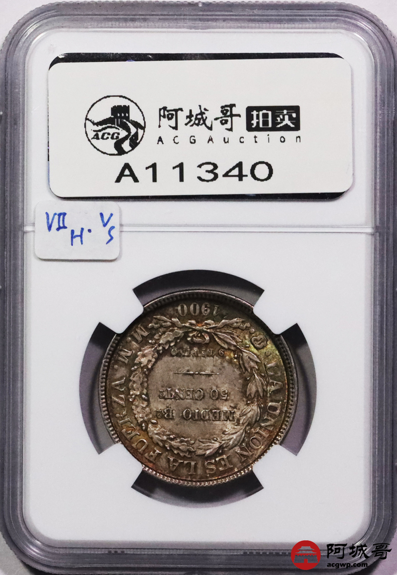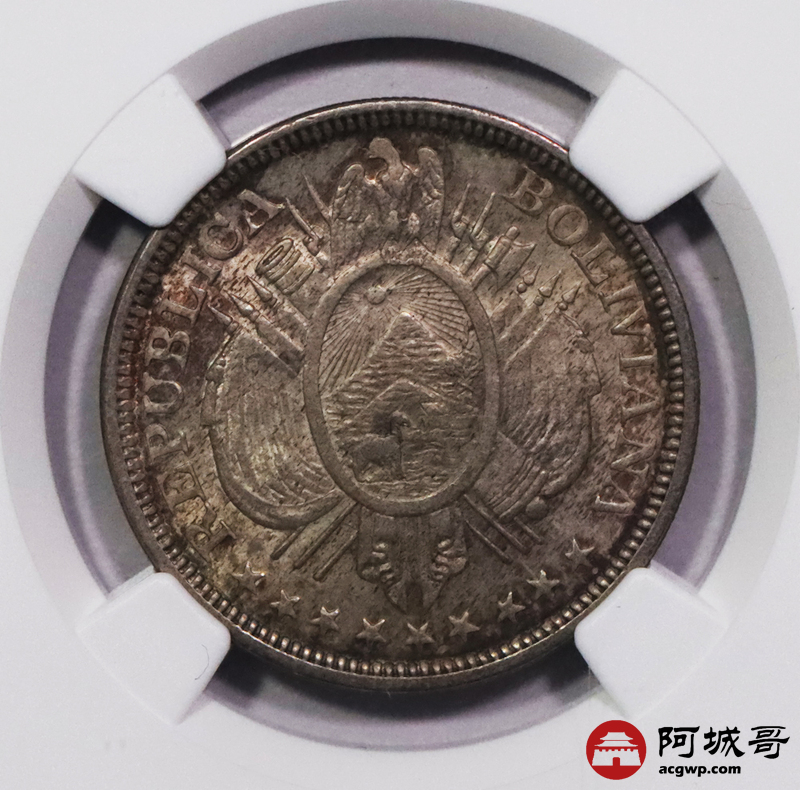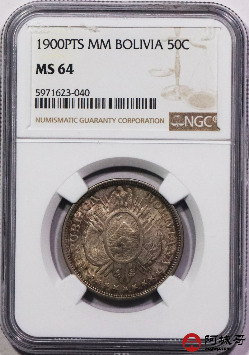 Lot:3687 1900南美玻利维亚50C银币一枚,淡彩包浆NGC MS64评级编号:5971623-040