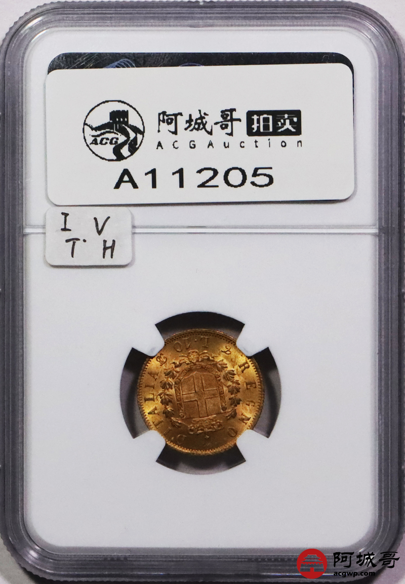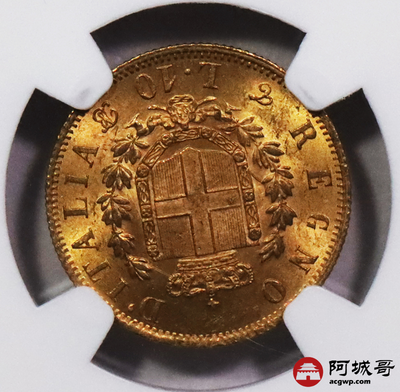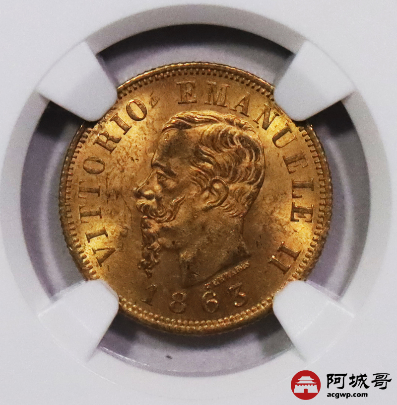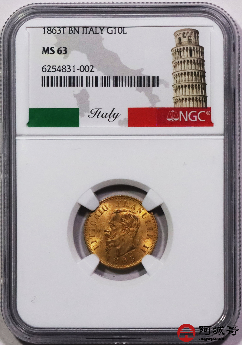 Lot:3693 意大利1863年艾曼纽尔二世10里拉金币一枚 NGC MS63评级编号:6254831-002