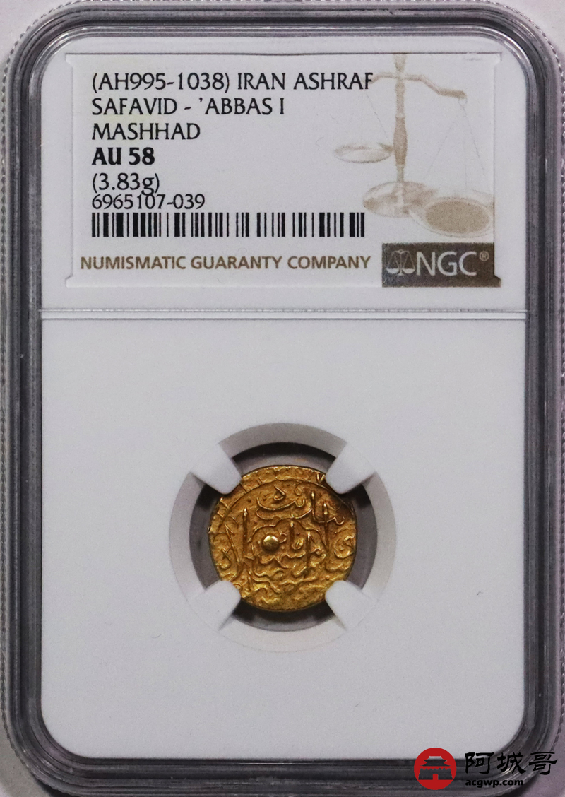 Lot:3703 公元16世纪萨法维王朝阿巴斯一世阿什拉菲金币一枚(3.83g)NGC AU58评级编号:6965107-039