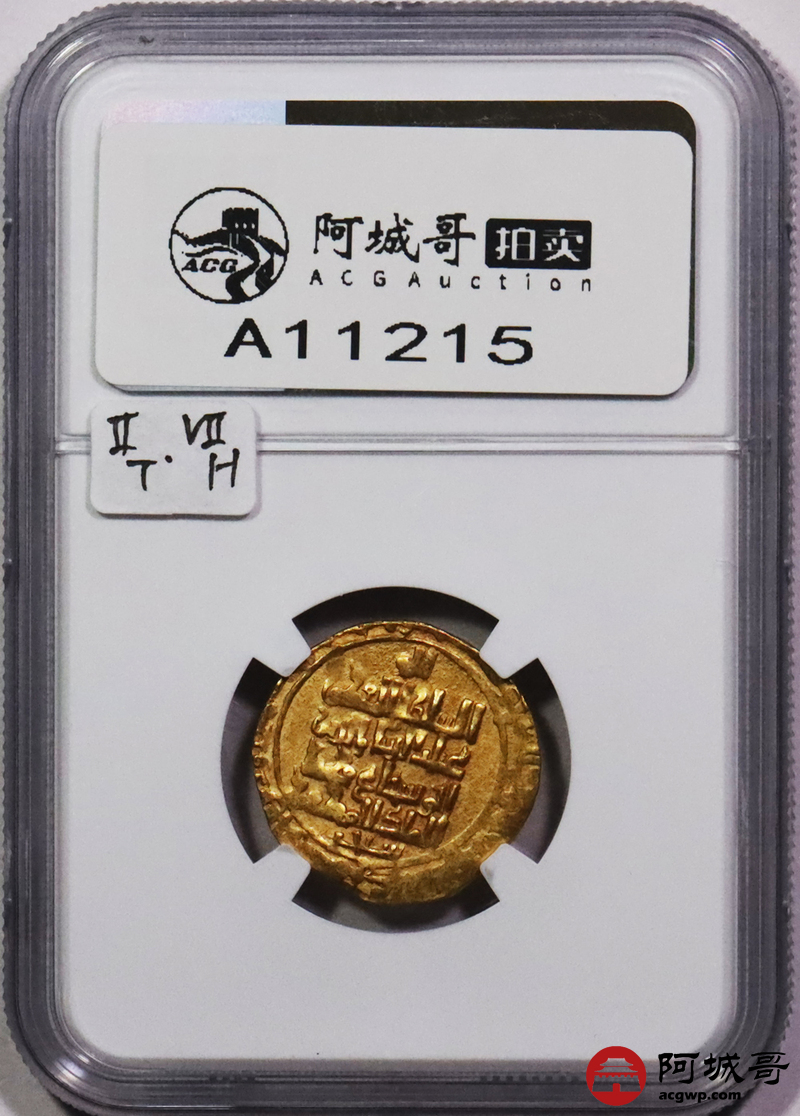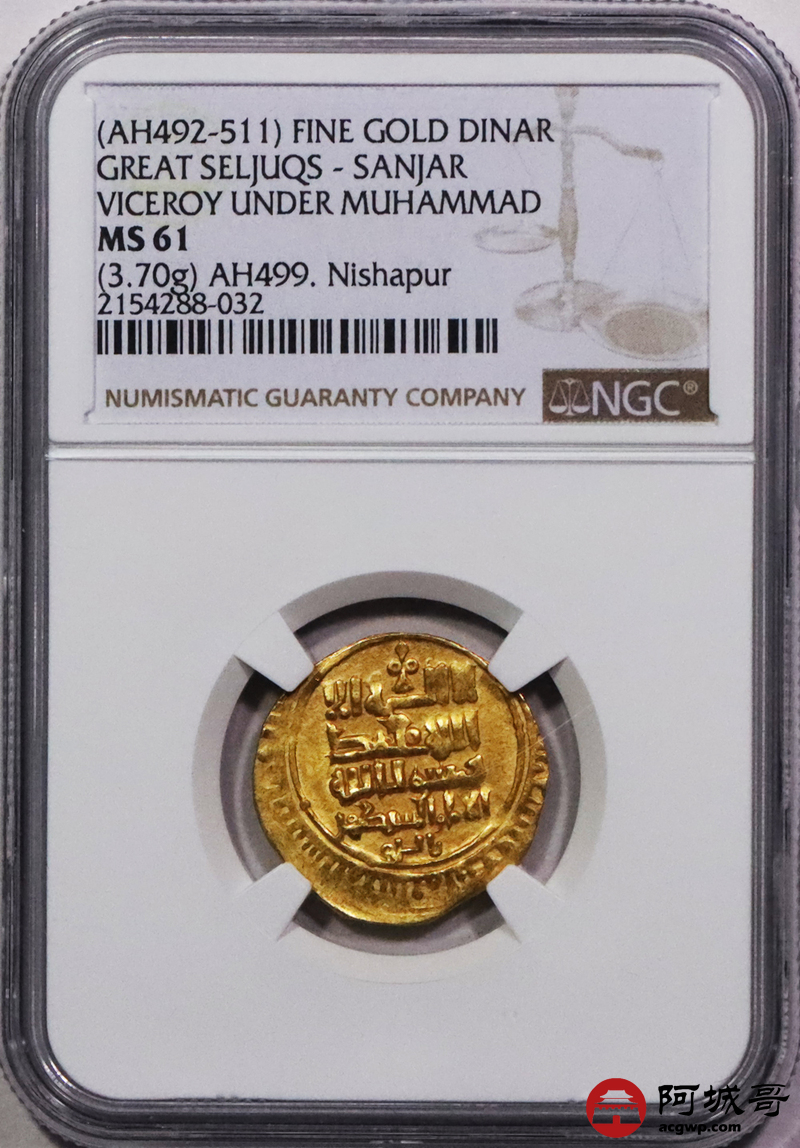 Lot:3662 公元11世纪末期丝路塞尔柱帝国穆罕默德的总督第纳尔金币一枚,NGC MS61评级编号:2154288-032