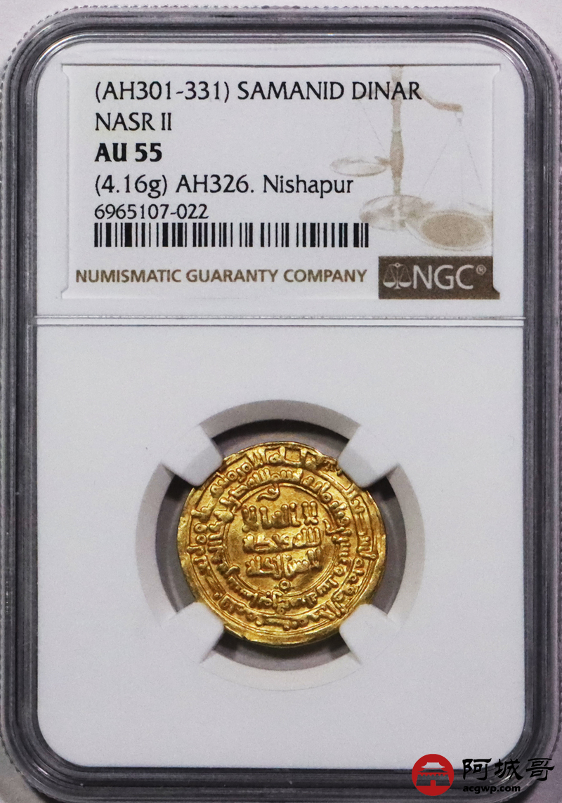 Lot:3702 公元10世纪初期丝路萨曼王朝纳斯尔二世第纳尔金币一枚(4.16g)NGC AU55评级编号:6965107-022