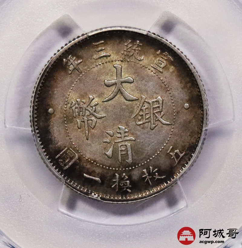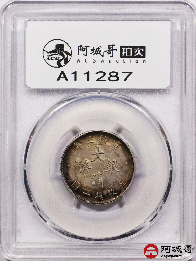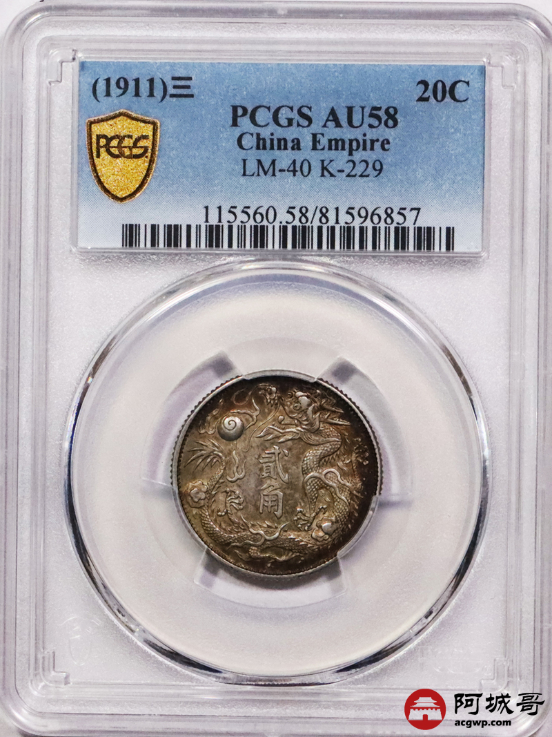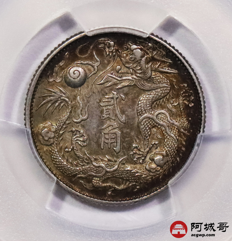 Lot:3061 1911宣统三年大清贰角银币一枚,打制精美,龙鳞饱满,酱红环彩底板 PCGS AU58 评级编号:81596857