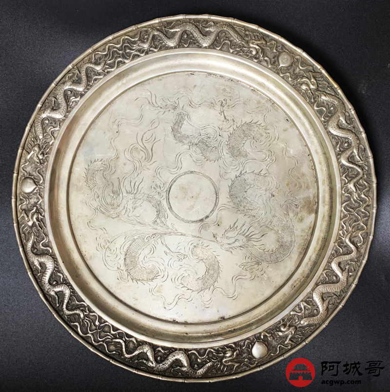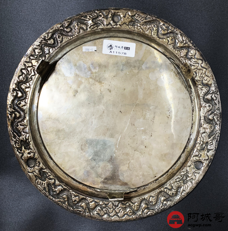 Lot:3849 清代龙纹茶盘,重:822克,直径:30厘米。底款:shinghai(上海) woshing(WOSHING为和盛银楼的拼音),见《中国银楼与银器》外销篇第167页