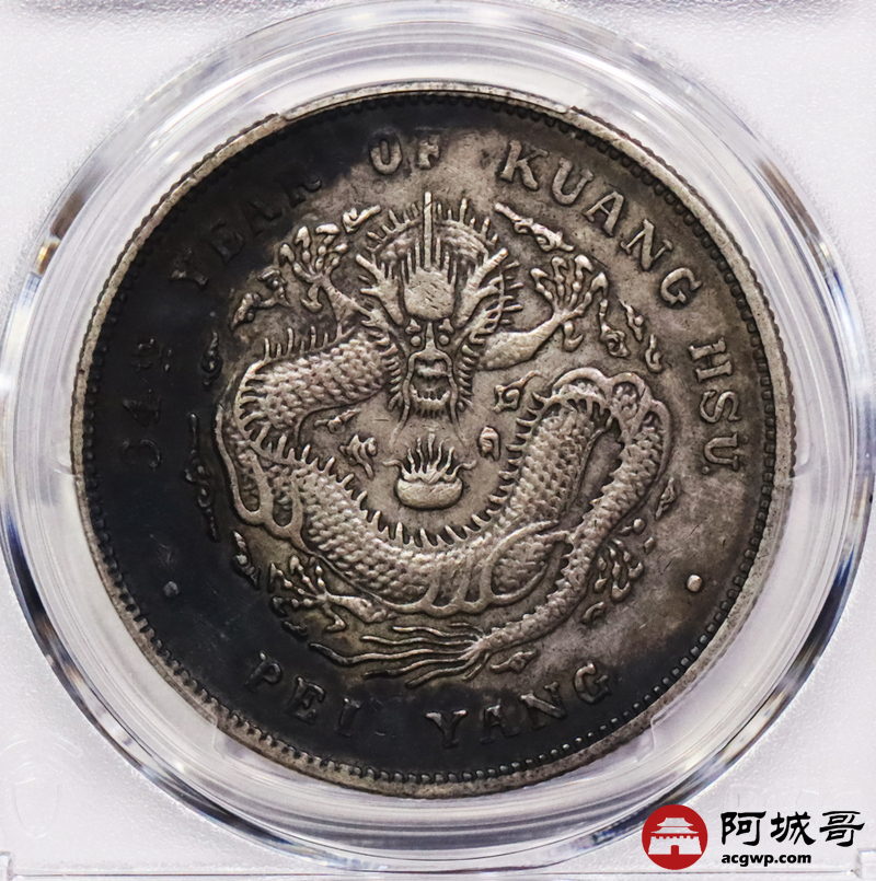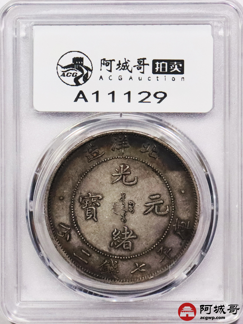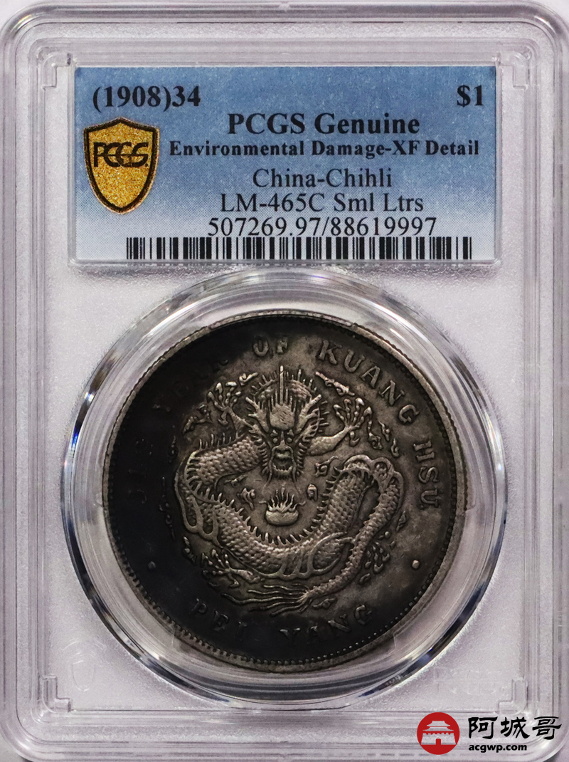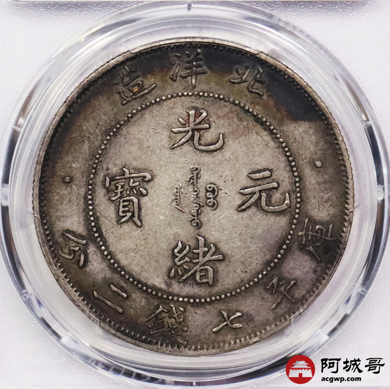 Lot:3331 1908光绪三十四年北洋造光绪元宝库平七钱二分银币一枚,小字版,环彩包浆PCGS XF评级编号:88619997
